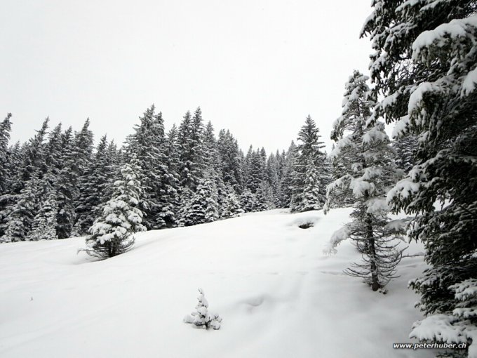 Meist Schneefall, neblig. Es hat eine (unten knappe) Unterlage und darauf unten ca. 10 cm oben ca. 20 cm Neuschnee gegeben. Bei 2'300 m umgekehrt da schlechte Sicht für den Steilhang und der Rücken sehr abgeblasen erschien.