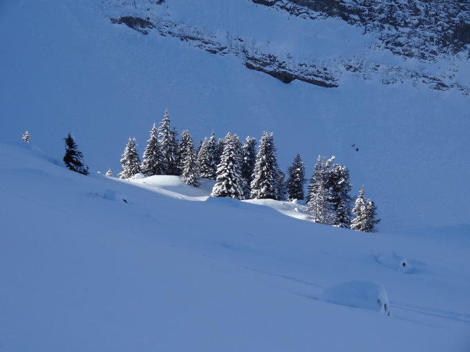 Schnee war noch locker, offenbar kaum verblasen, der Schlusshang stellte kein Risiko dar.