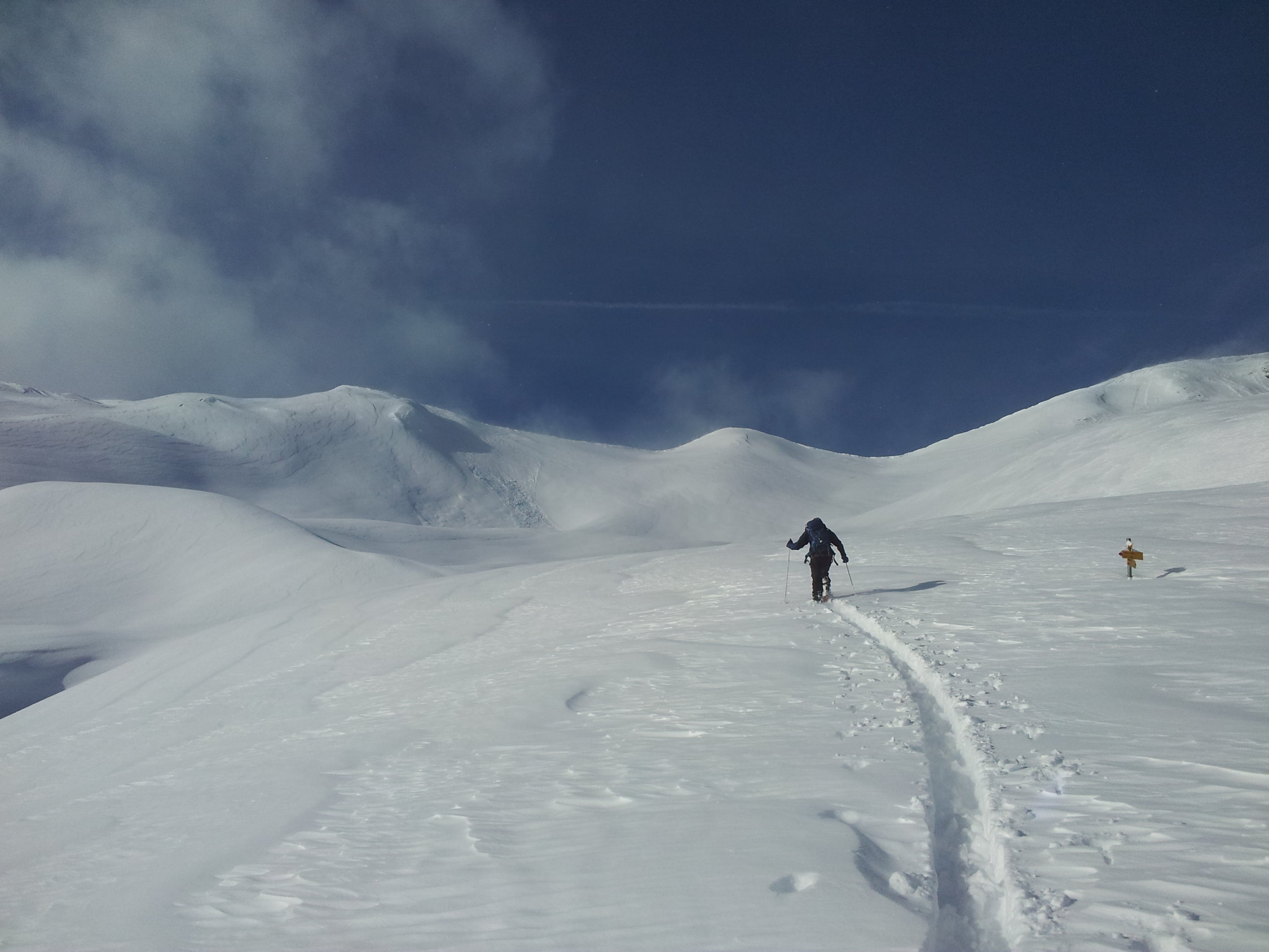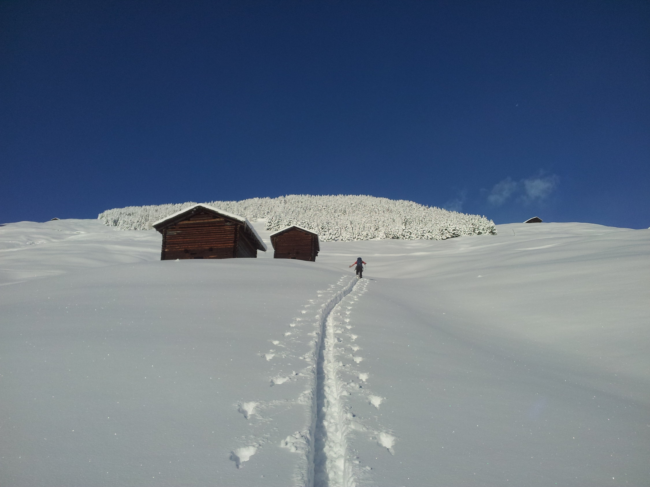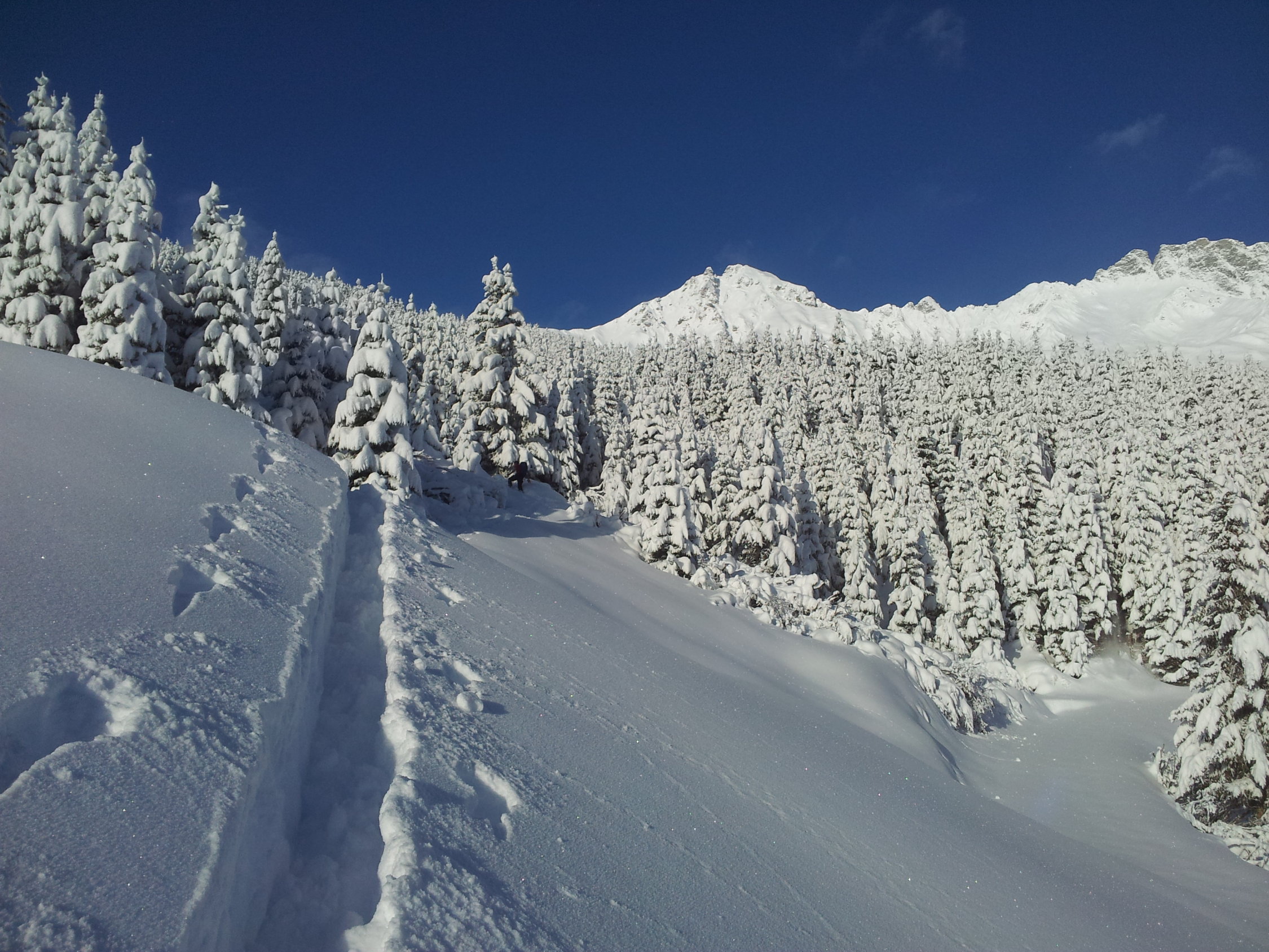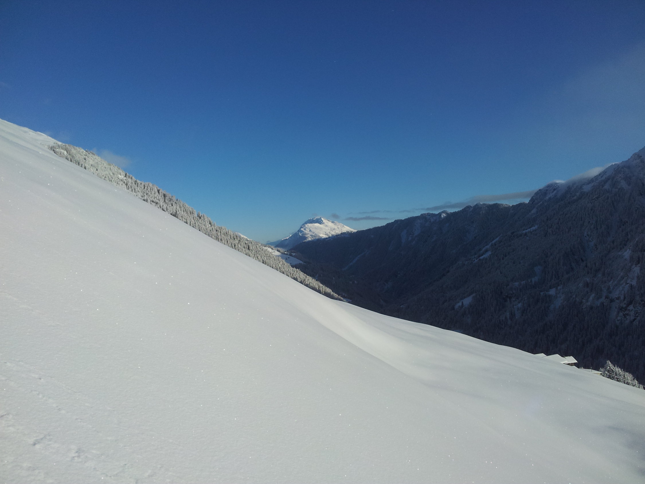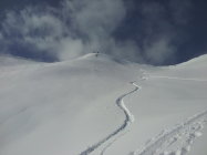 Start 50cm Pulver auf wenig bis keiner Unterlage aber nicht störend selbst in der Abfahrt, ab ca. 1400hm mit Unterlage und ca. 60cm Pulver, ab der Güner Hütta auf dem Kamm zunehmend windgeprägt da starker Südwind schon im Aufstieg, weiter Richtung Süden im Turrahus wolkenverhangen.
