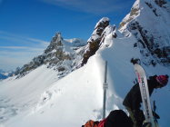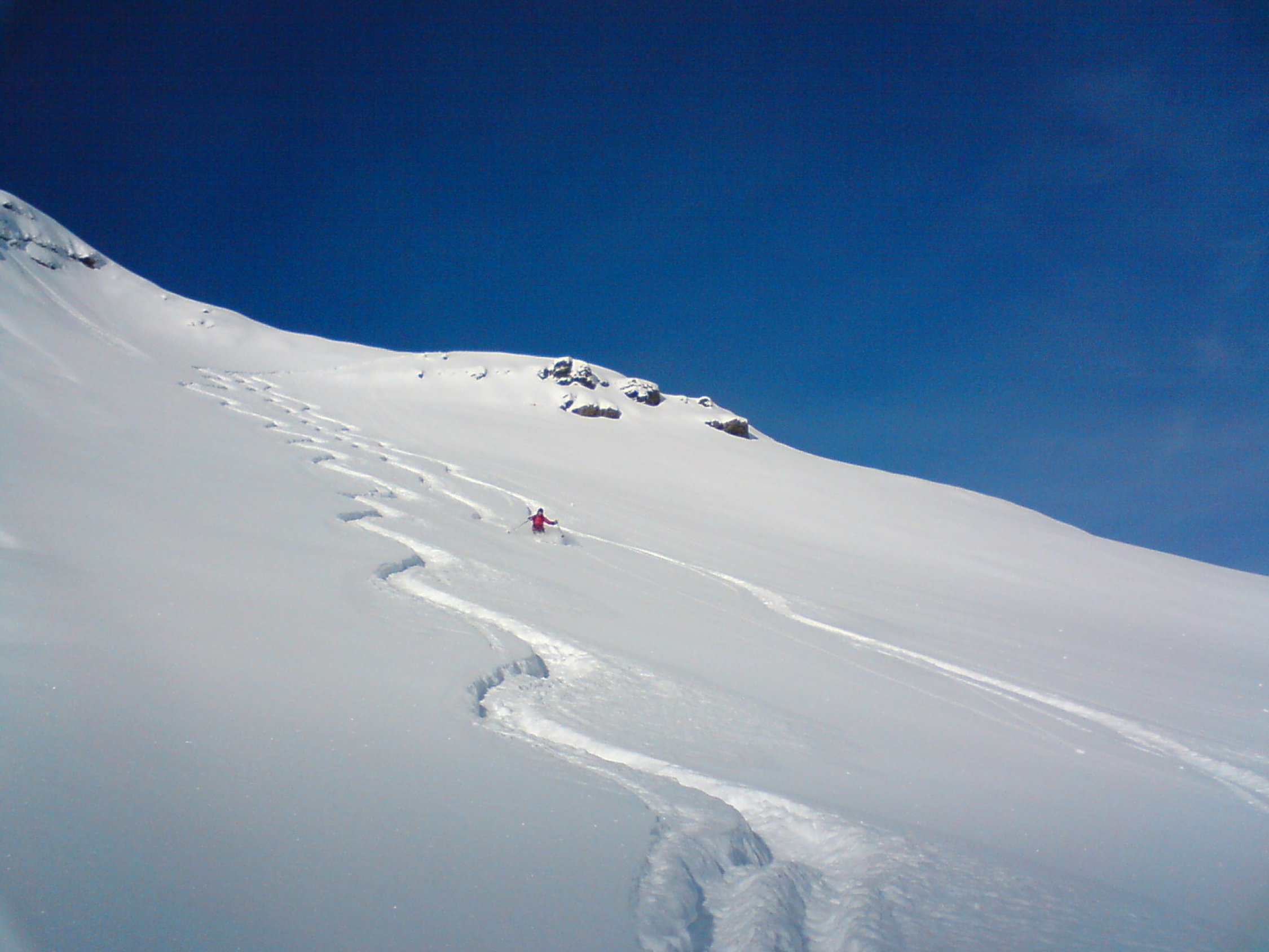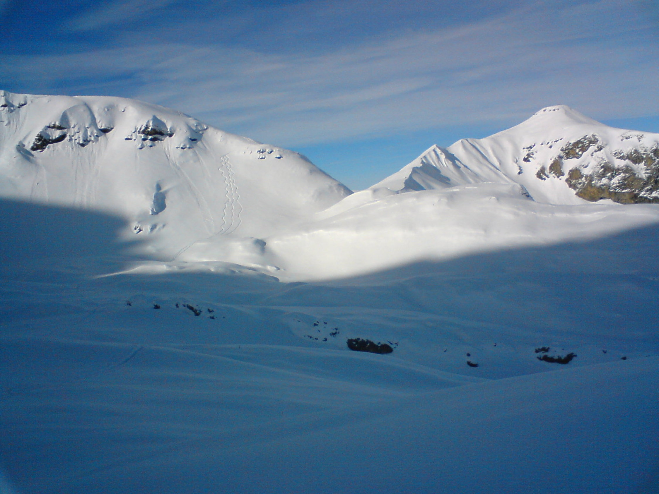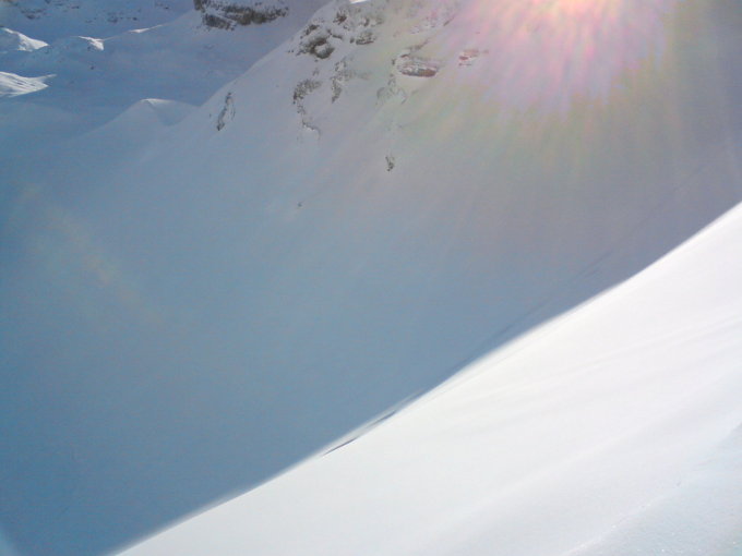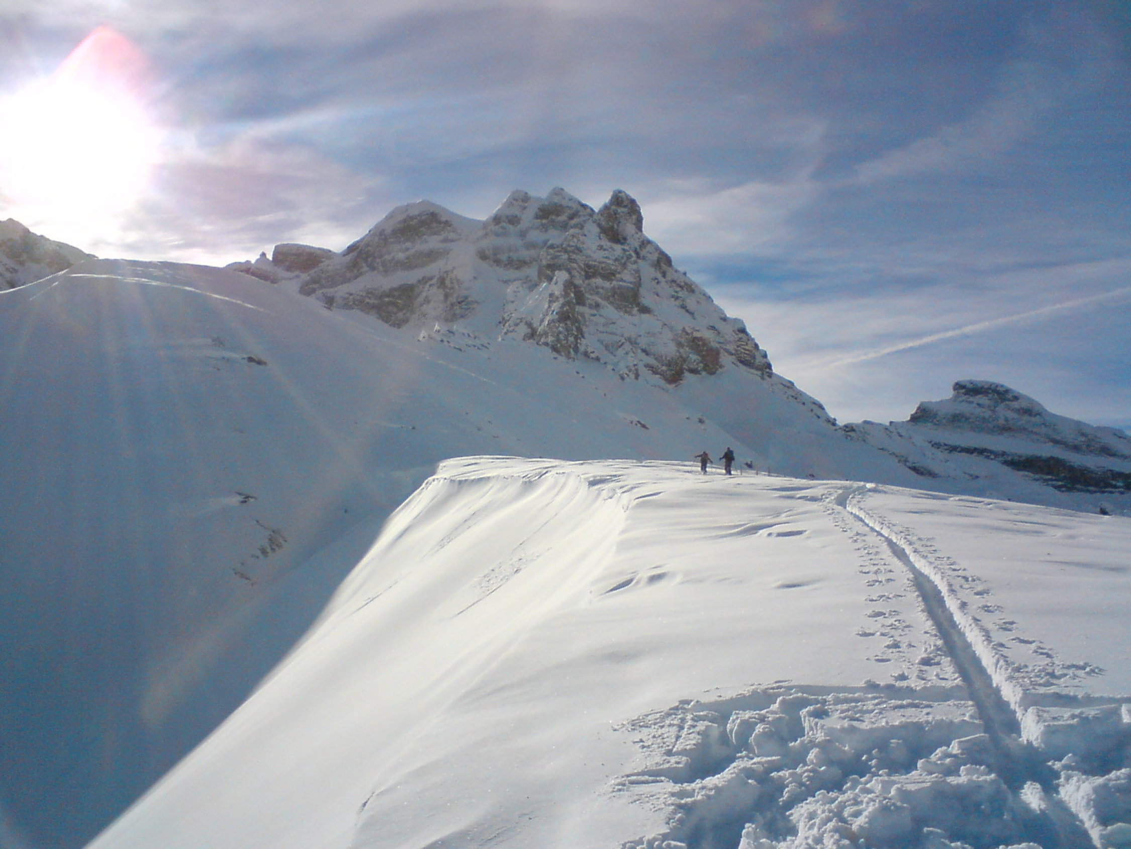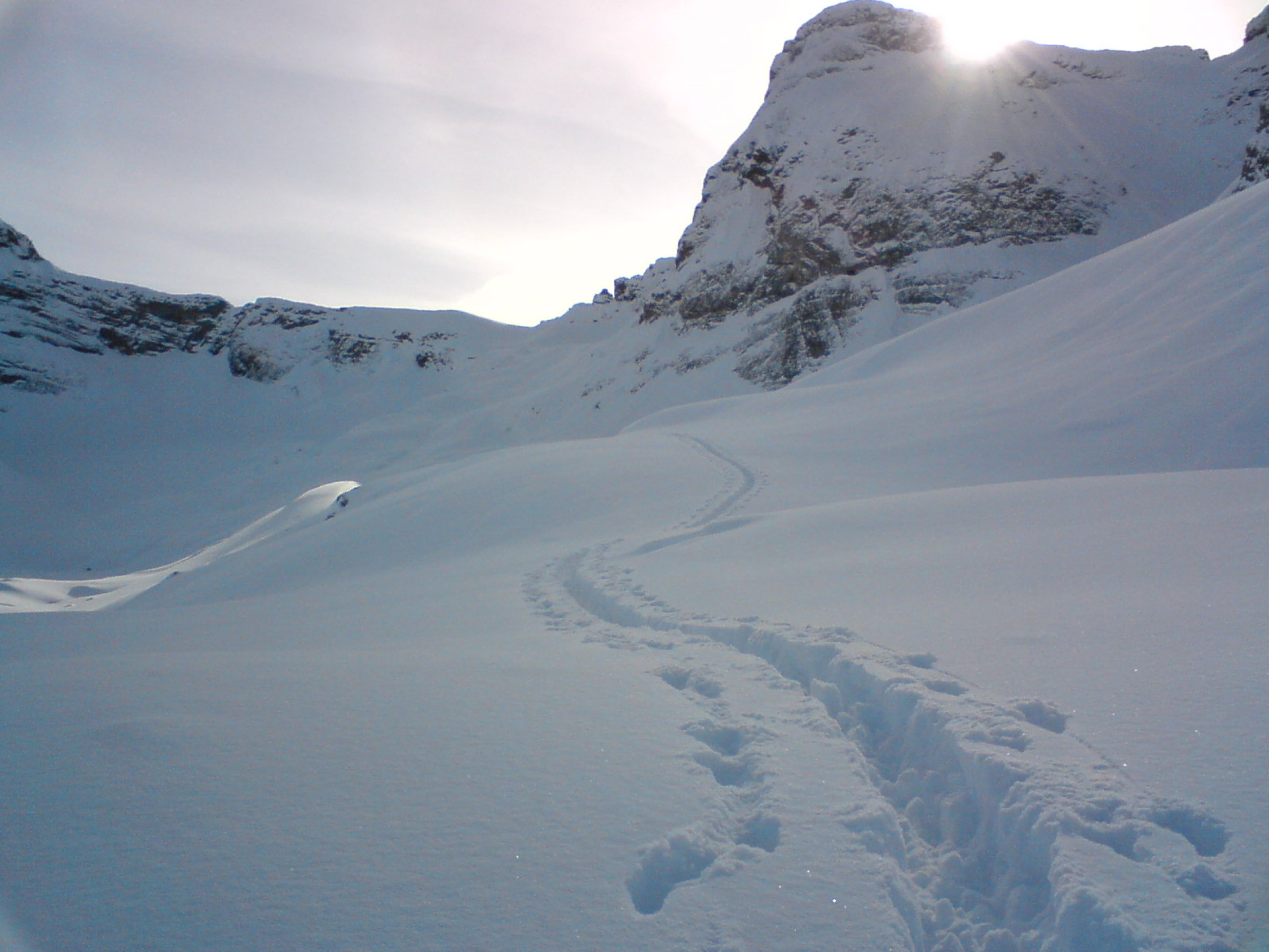 Abfahrt bis Oberrickenbach problemlos. Steingefahr grösser bei Abfahrt nach Urnerstaffel. Umweg über den wilden Böllen genommen. Der direkte Weg wäre aber gut gegangen. Am Abend wurde er jedenfalls begangen. Spät gestartet, dann 80 cm Neuschnee spuren. Definitiv zu spät. Umgekehrt auf rot Grätli.