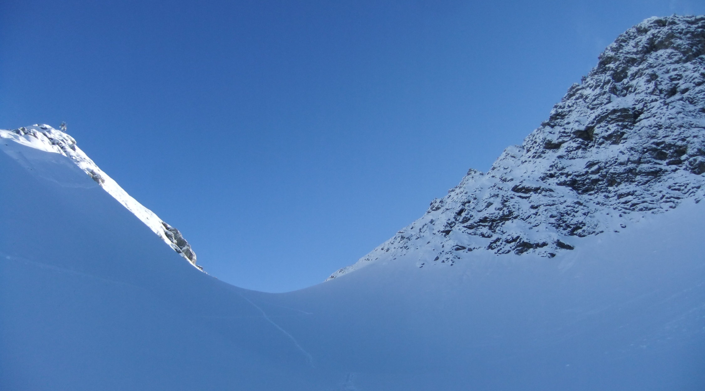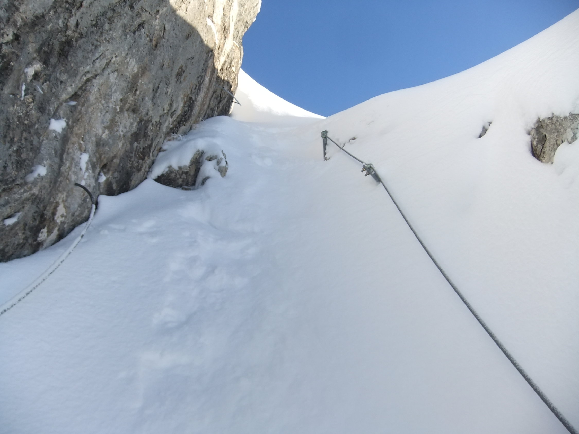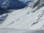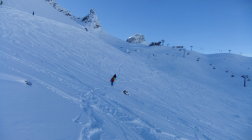 Ab der Bergstation mußte ich alles spuren. Für die Hangquerung zum Gipfelgrad benutzte ich meine Steigeisen, da der frische Pulverschnee auf dem Firn darunter noch nicht hielt. So stieg ich frontal hoch, um möglichst nicht lange zu queren.
