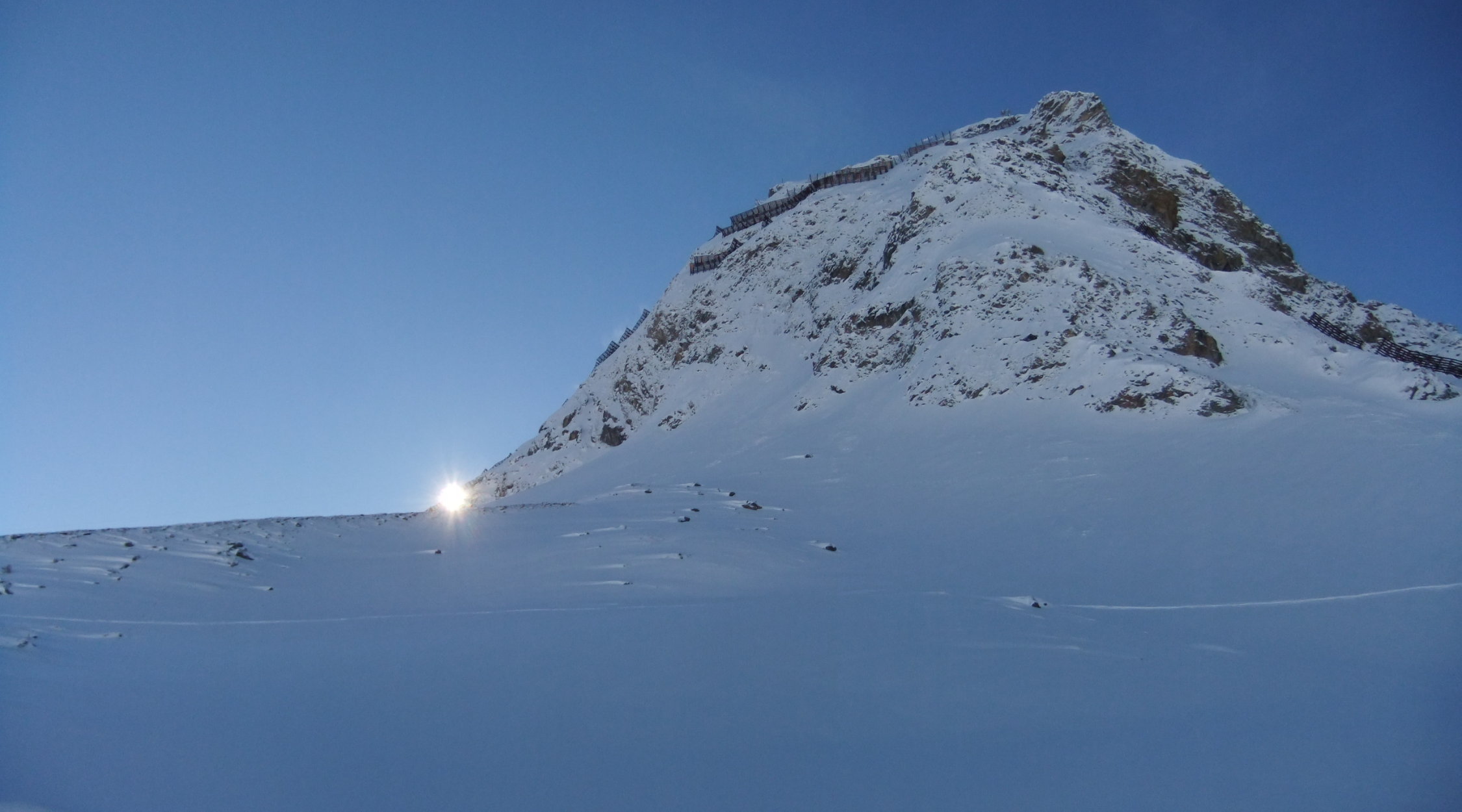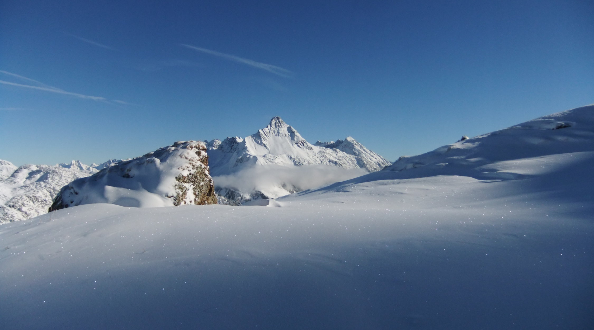25 cm Neuschnee, Sonnenaufgang noch durch Nebel bedeckt, der sich jedoch schnell lichtete. Dann Traumwetter und Traumschnee.