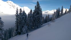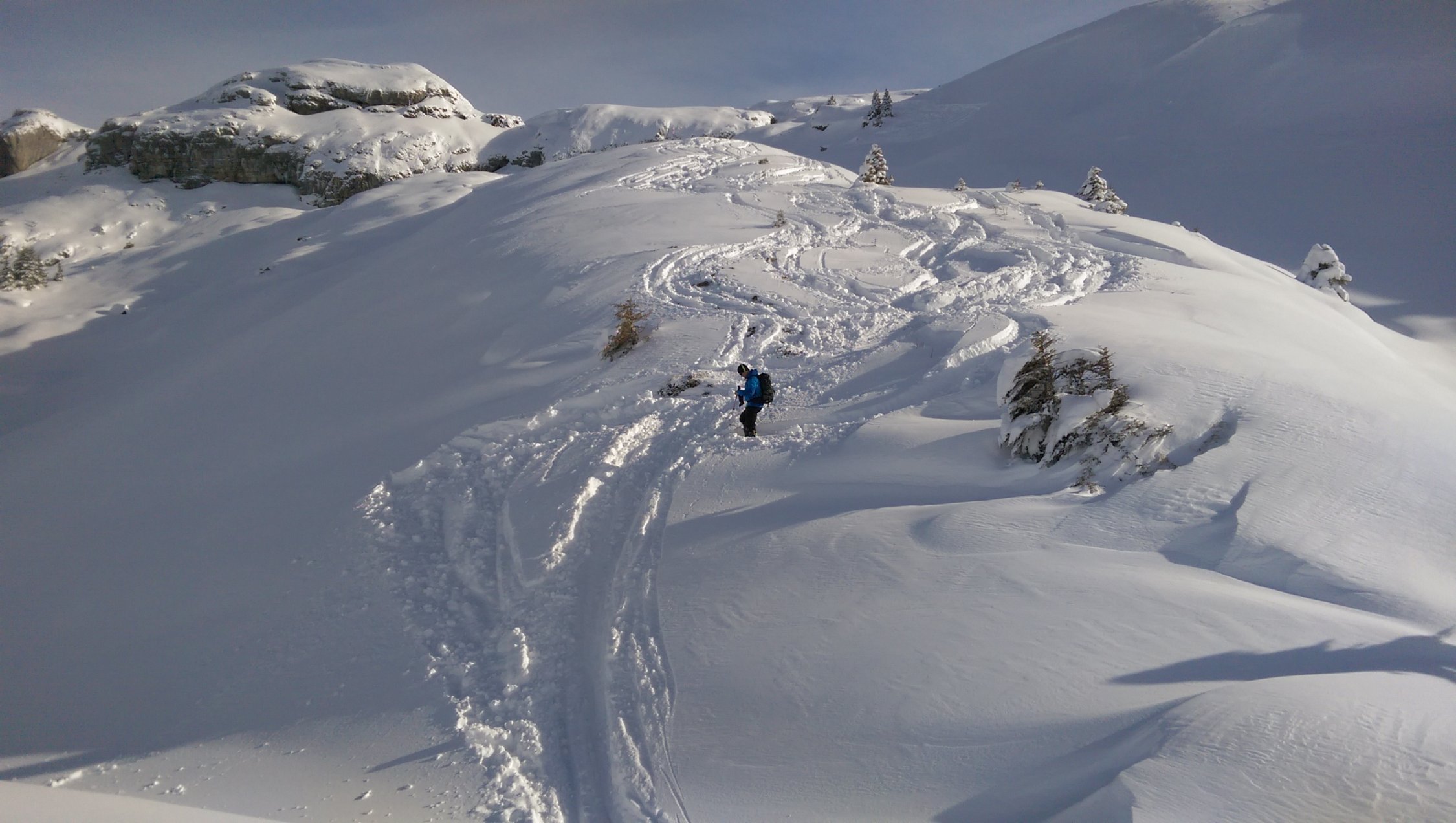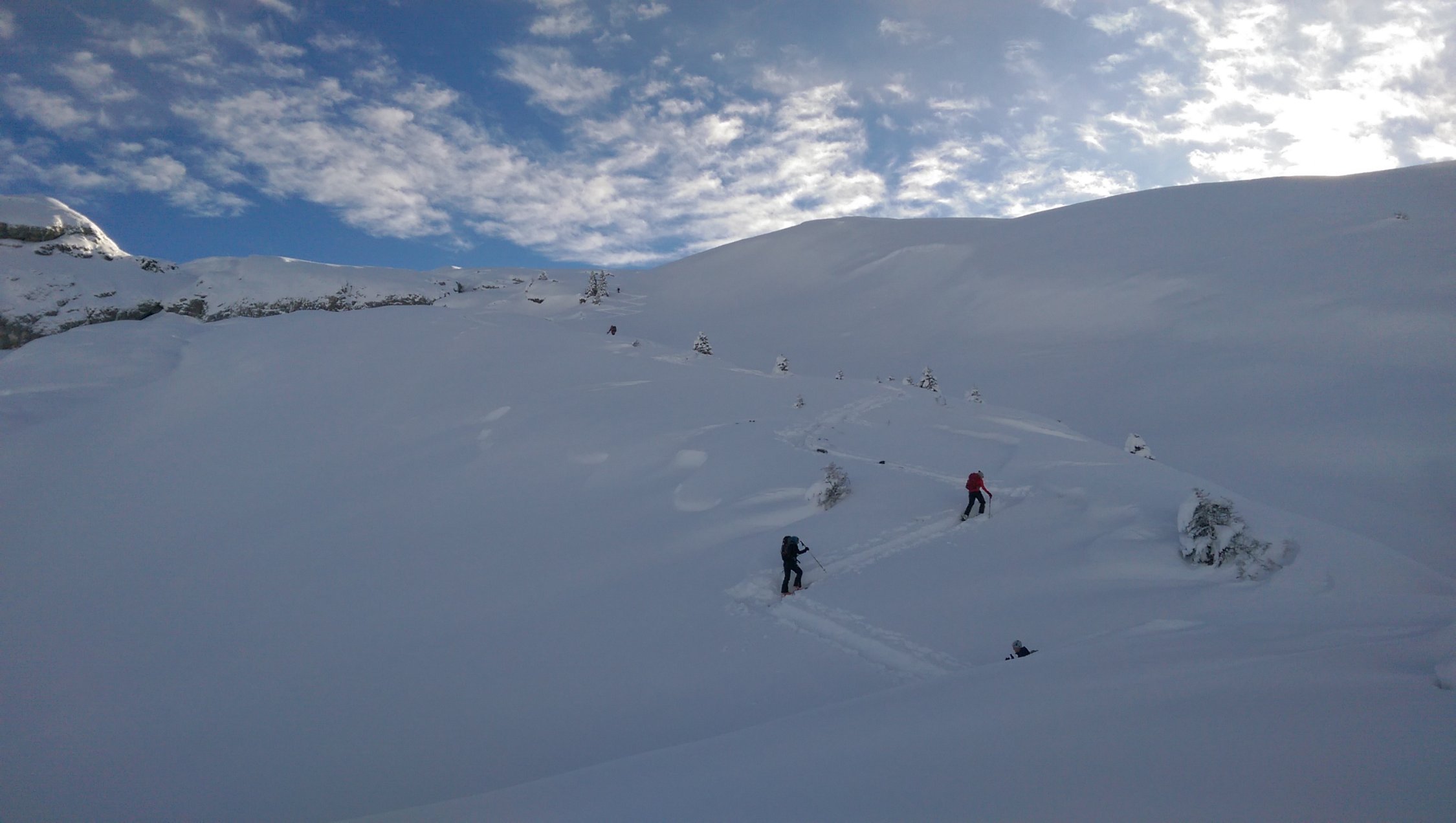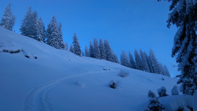 Abfahrt im oberen Bereich nur in der Aufstiefspur möglich Schnee zu tief Neigung zu flach. Im unteren steilen Bereich Tiefschneefahren möglich. Allerdings einige Steine und Latschen.