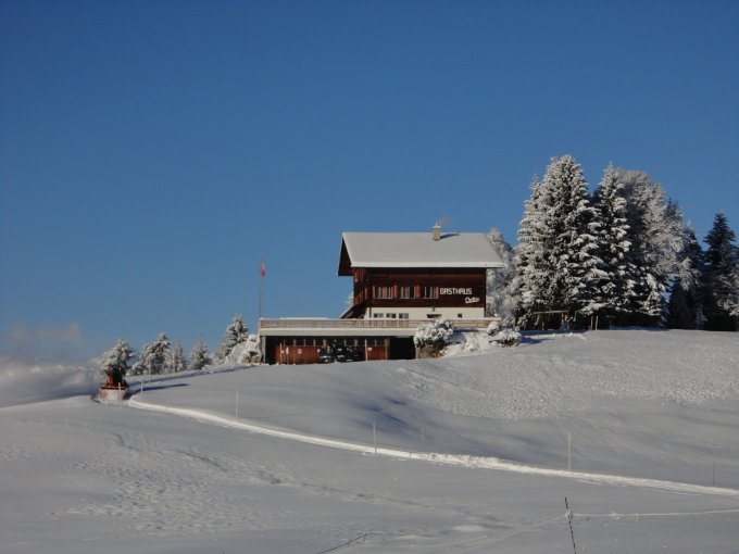Wir durften beim Berghaus Mottis parken, was allerdings für die letzten Meter den Einsatz von Schneeketten erforderte. Etwas später wurde die Strasse dann geräumt. Der Einkehrschwung im Berghaus mit Aussichtsloge ergibt sich dann von selbst....