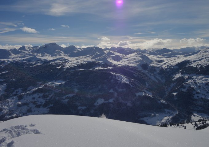Gute Schneelage ab Mottis. Ca. 20-30 cm ohne Windeinfluss gefallener Neuschnee auf fester, teilweise harschiger Grundlage. Abfahrt in den Osthängen Richtung Gadenstätt schönster Pulver und noch wenig verspurt; Abfahrt nach Mottis auch weitgehend unverspurt, allerdings stellenweise recht flach.