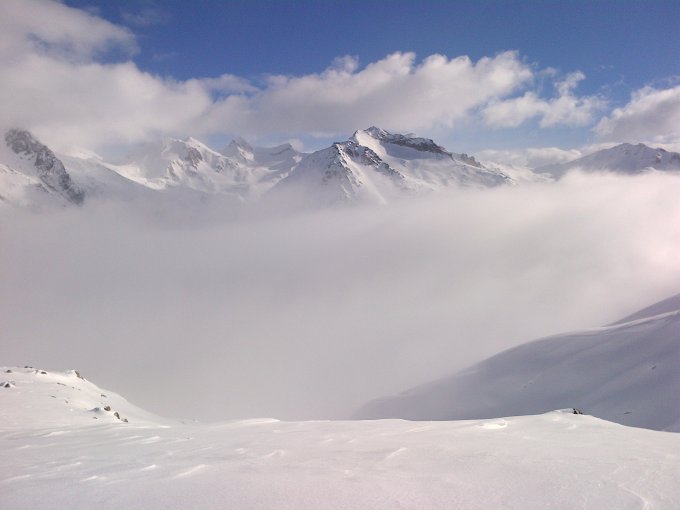 Zwischen 1400 m und 1800 m gute Sicht. Ab da bis auf 2200 m Nebel und nur kurzzeitig mehr als 50 m Sicht. Gut, dass die alte Lifttrasse als Anhalt zur Verfügung steht und schon eine Spur gelegt war. Ab 2200 m freie Sicht und schöner Rundumblick.