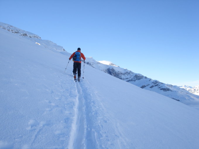 Top Verhältnisse im Aufstieg. Gute Spur in frischem Pulver. Es hat rund 20 Zentimeter Neuschnee, der stellenweise auf einer Harschschicht liegt.