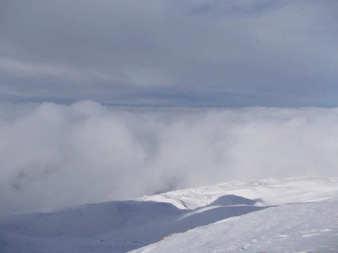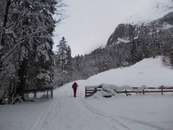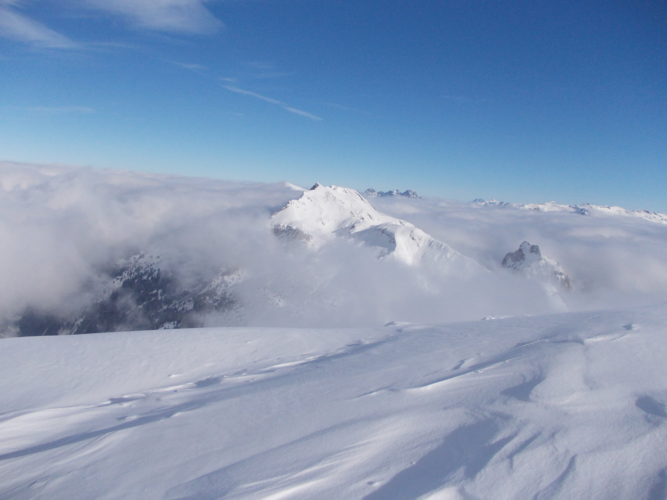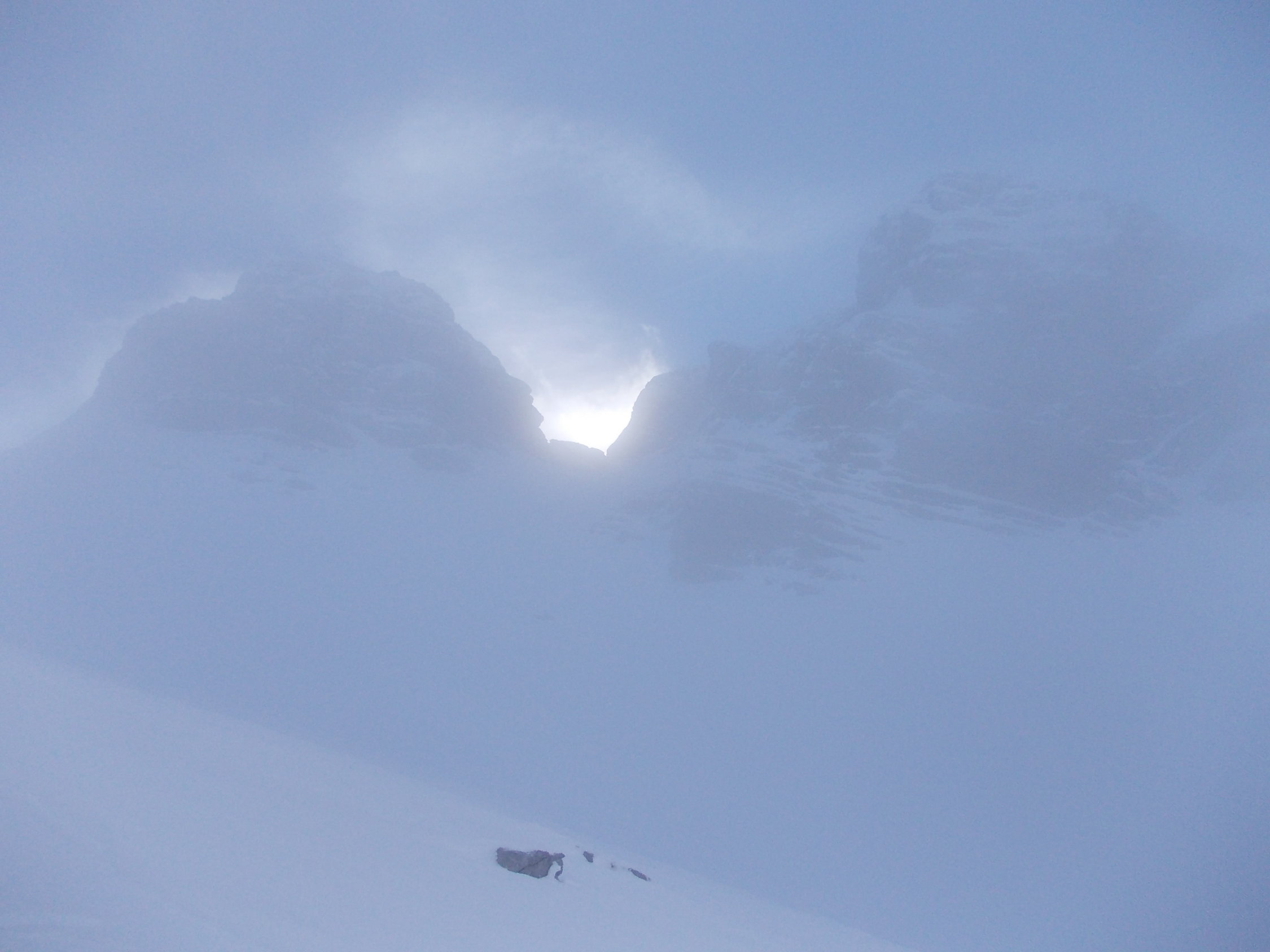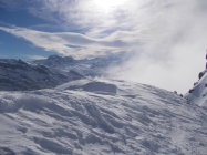Zu Beginn der Tour bedeckt, die Wolken hingen in den Gipfeln, etwa vom Fluebrig. Ab Rinderweid praktisch Whiteout bis auf etwa 2000 m. Danach weitestgehend Nebellichtung und Einsetzen von Wind.