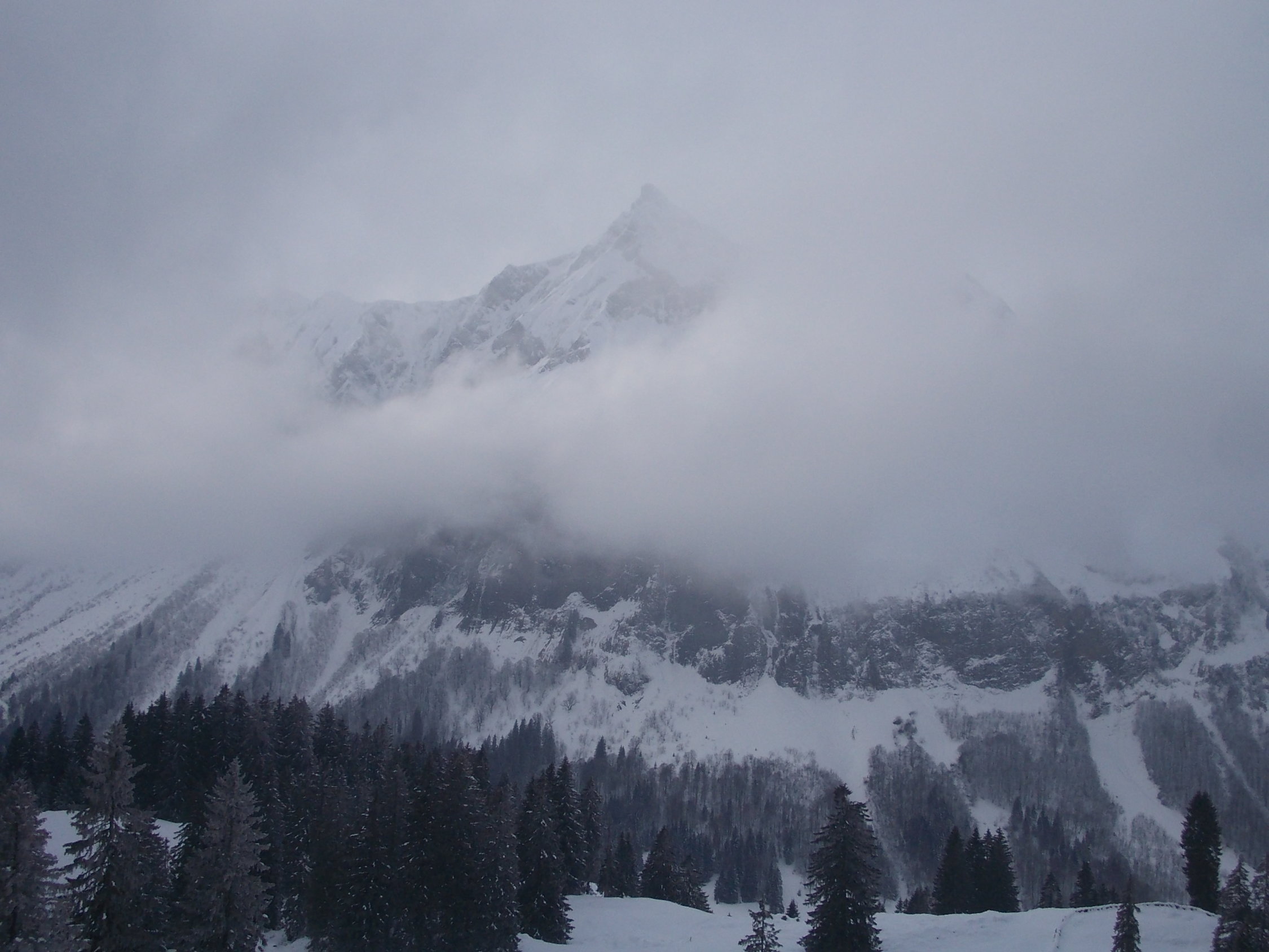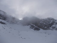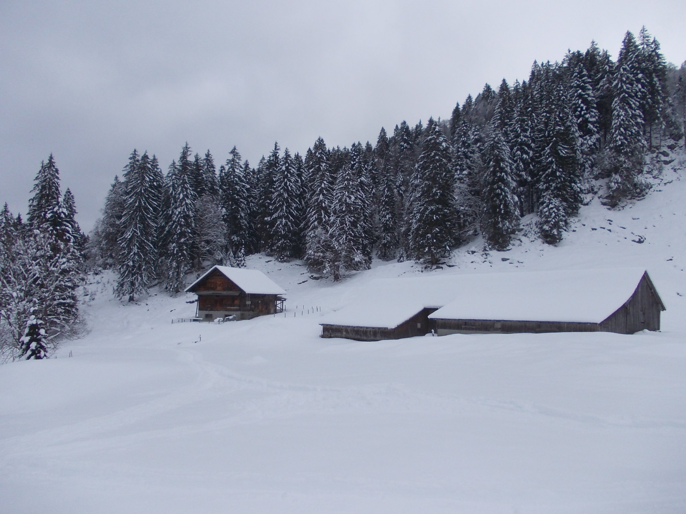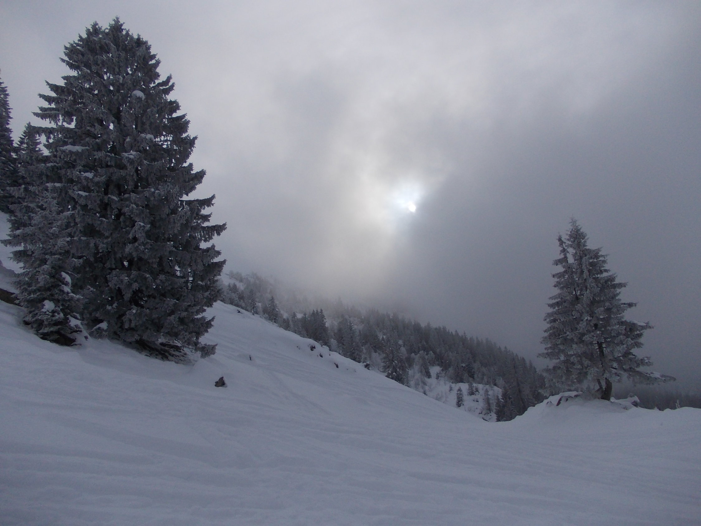 Zu Beginn der Tour bedeckt, die Wolken hingen in den Gipfeln, etwa vom Fluebrig. Ab Rinderweid praktisch Whiteout bis auf etwa 2000 m. Danach weitestgehend Nebellichtung und Einsetzen von Wind.