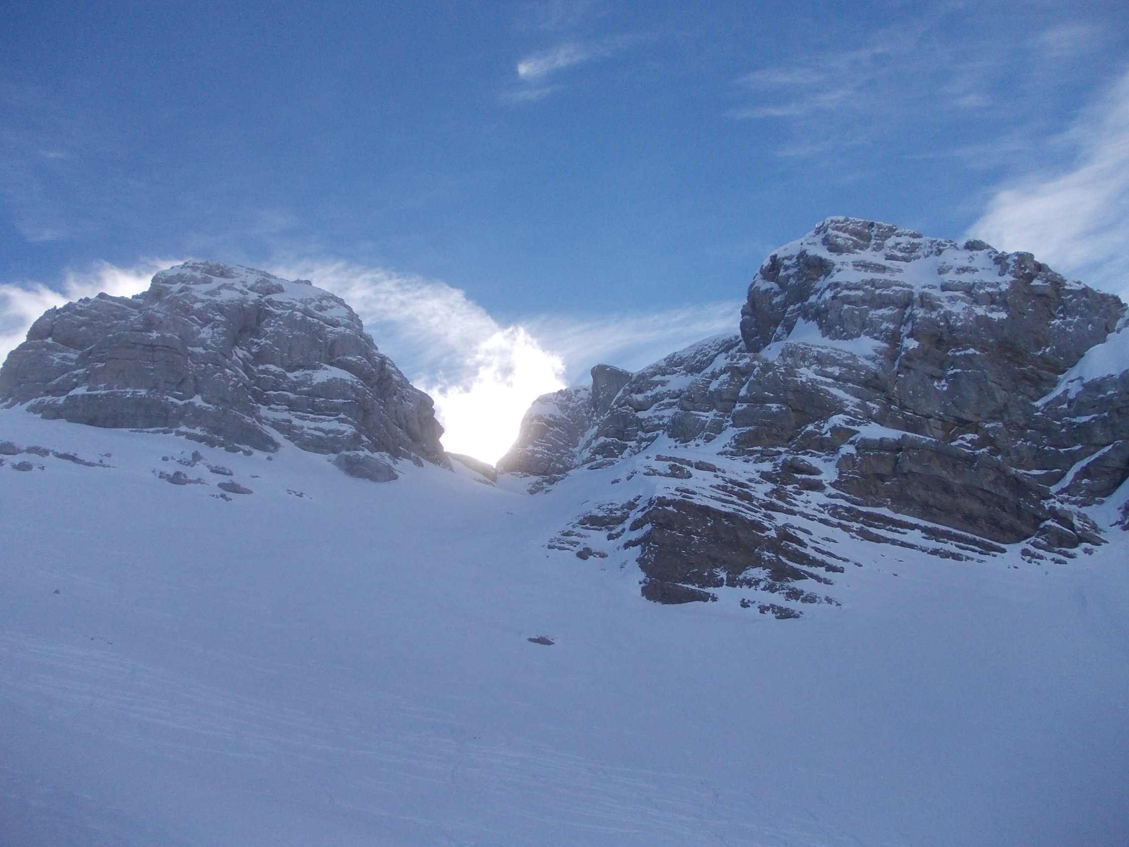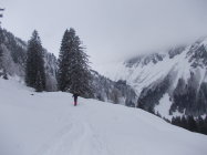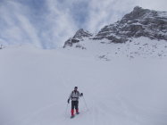 Anregender Abstieg durch oft noch pulvrigen Schnee, auch wenn die Hänge teils schon recht zerfahren waren. Es waren heute nicht allzu viele Tourengeher unterwegs.