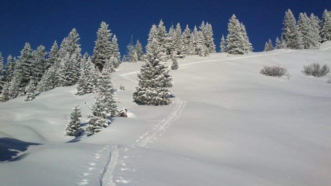 ca.20cm Neuschnee auf tragender Altschneedecke, lockere Pulverabfahrt, lediglich in den steilsten, sonnenbeschienenen Südhängen etwas schwerer