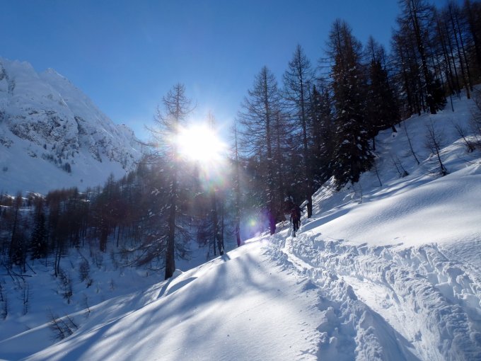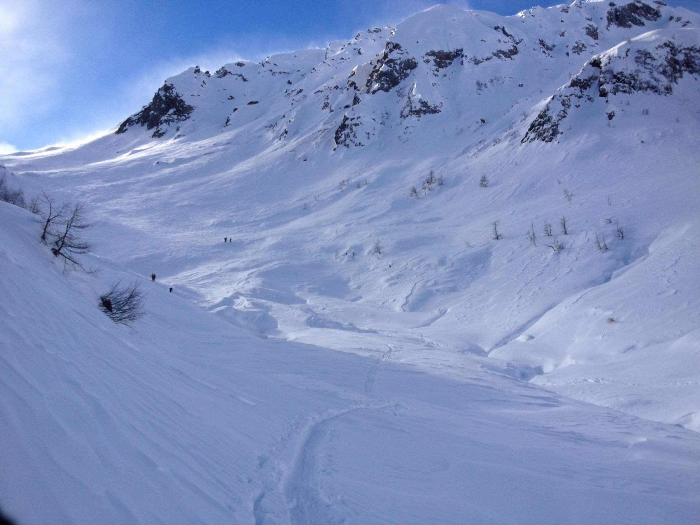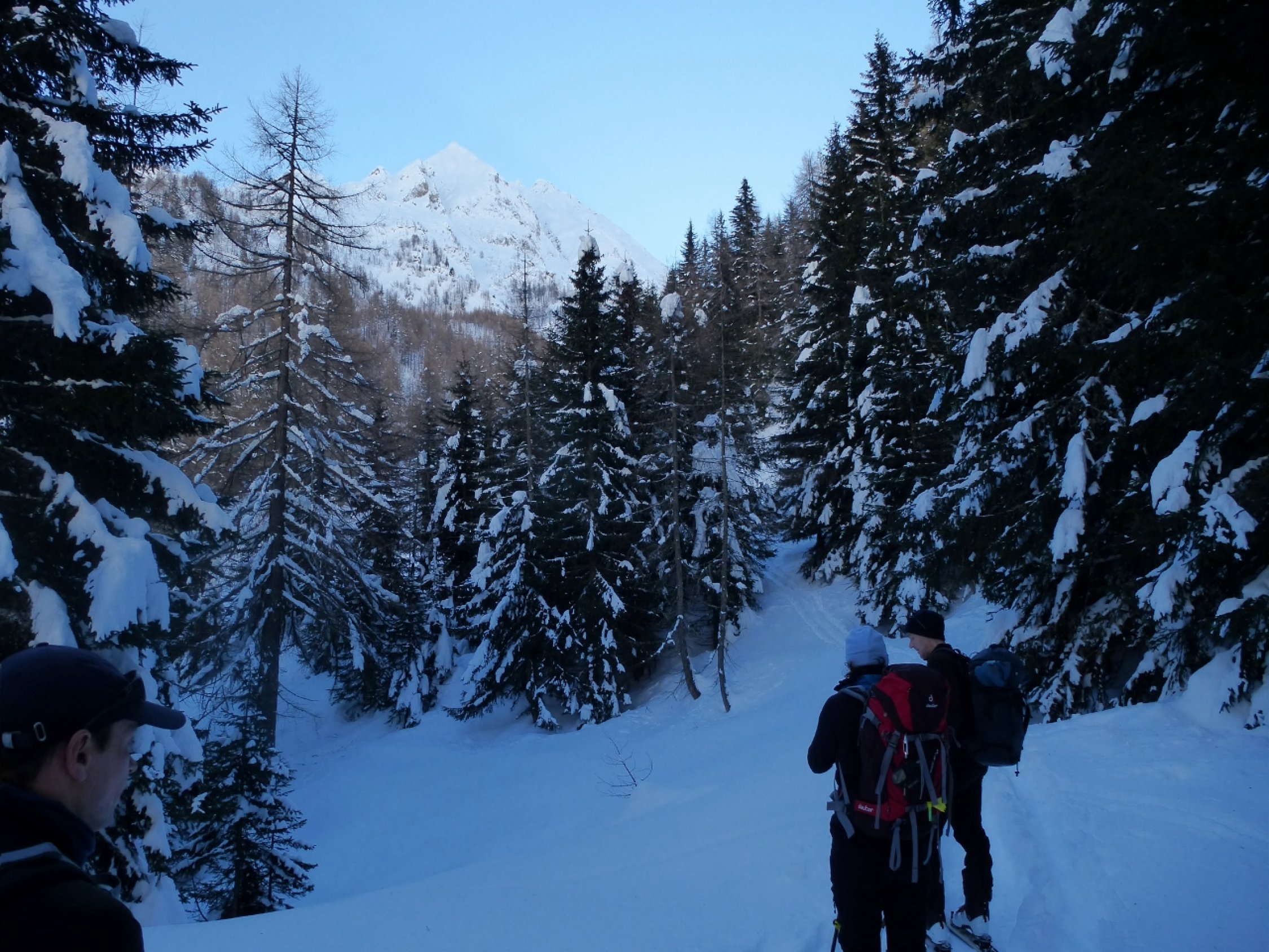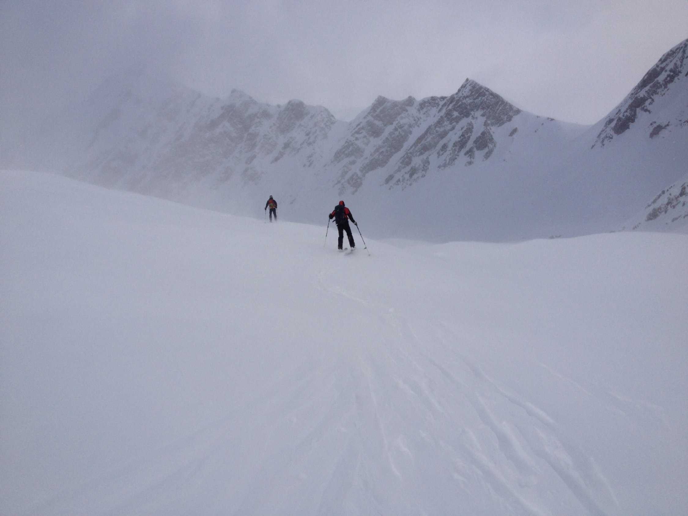 Am Samstag Sonnenschein und relativ windstill noch im Tal. Oberhalb der Waldgrenze dann frischer und bei der Cap. Cristallina stürmisch. Schnee liegt genug bis ins Tal. Allerdings hat der Nordwestwind ordentlich Schnee verfrachtet. Triebschnee ist definitiv das Gefahrenmuster. Am Sonntag über die Aufstiegsroute zurück, da wir wegen Sturm und minimaler Sicht auf die Abfahrt durchs Val Cavagnolo verzichtet haben. Starker Wind bis zur Waldgrenze und Risse in der Schneedecke beobachtet. Dafür wenigstens im Waldstück ein paar schöne, aber kurze Powderabfahrten.