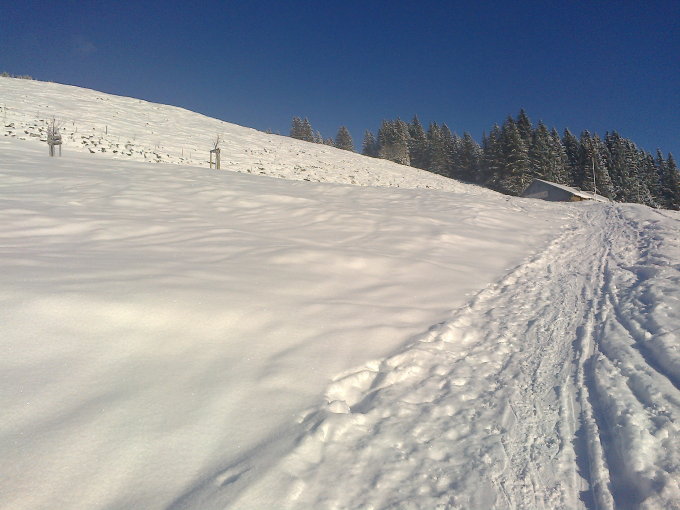 15cm Neuschnee, oben auf gutem Untergrund und super Schnee, unten zum Teil mit wenig Unterlage. Auf Höhe Buchlalpe wenig Schnee, siehe Foto.