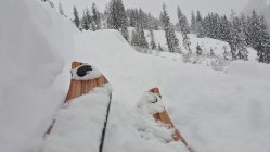 Bei der Abfahrt muss man auf Bäche und Gräben aufpassen, da sie noch nicht stabil eingeschneit sind. Durch den starken Wind gibt es viel Windverfrachtungen