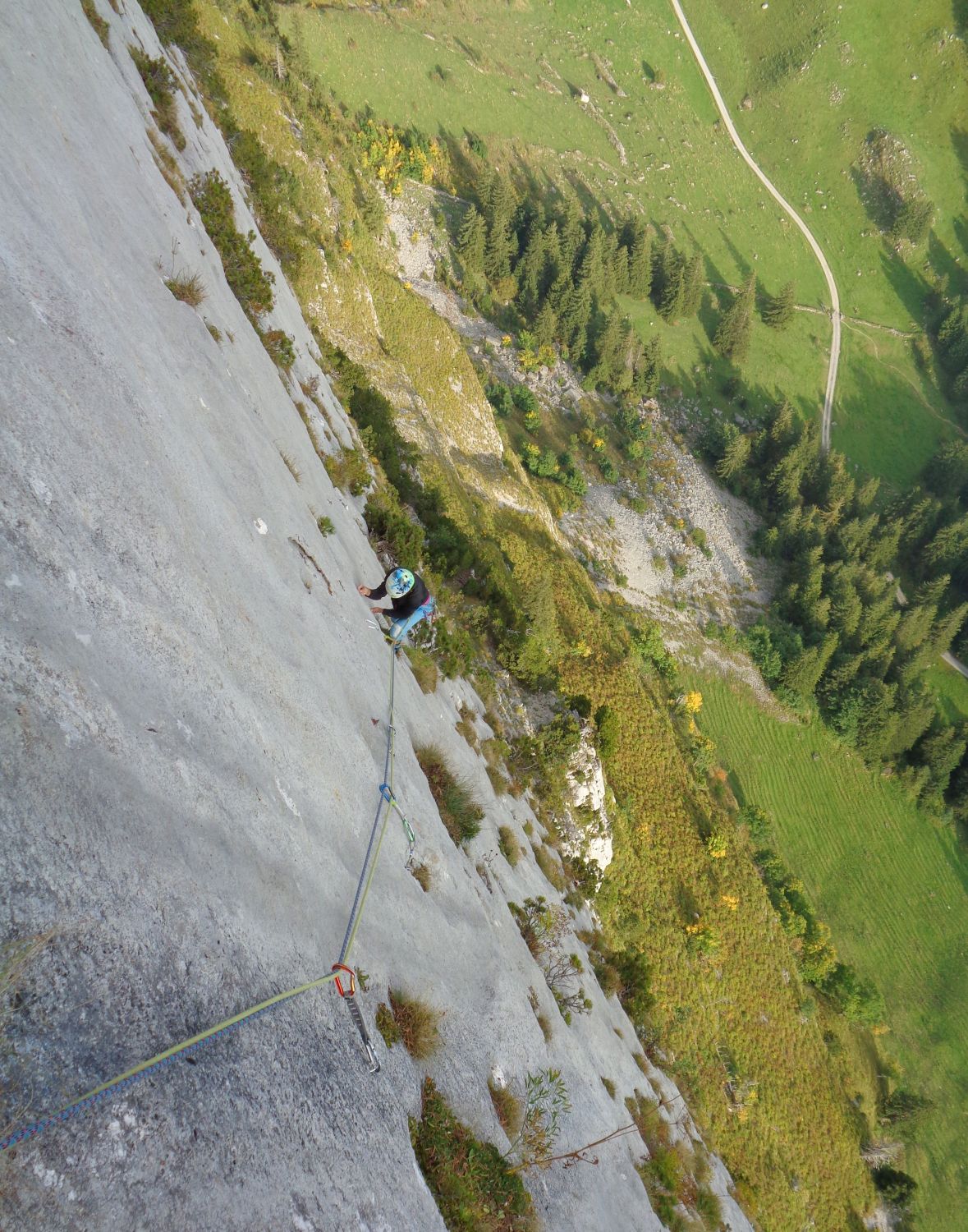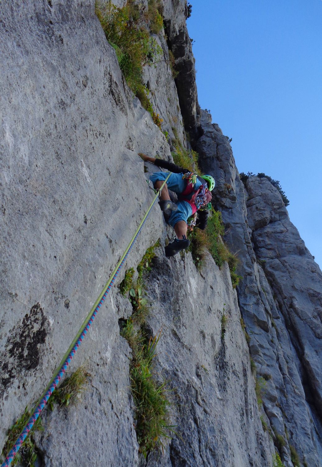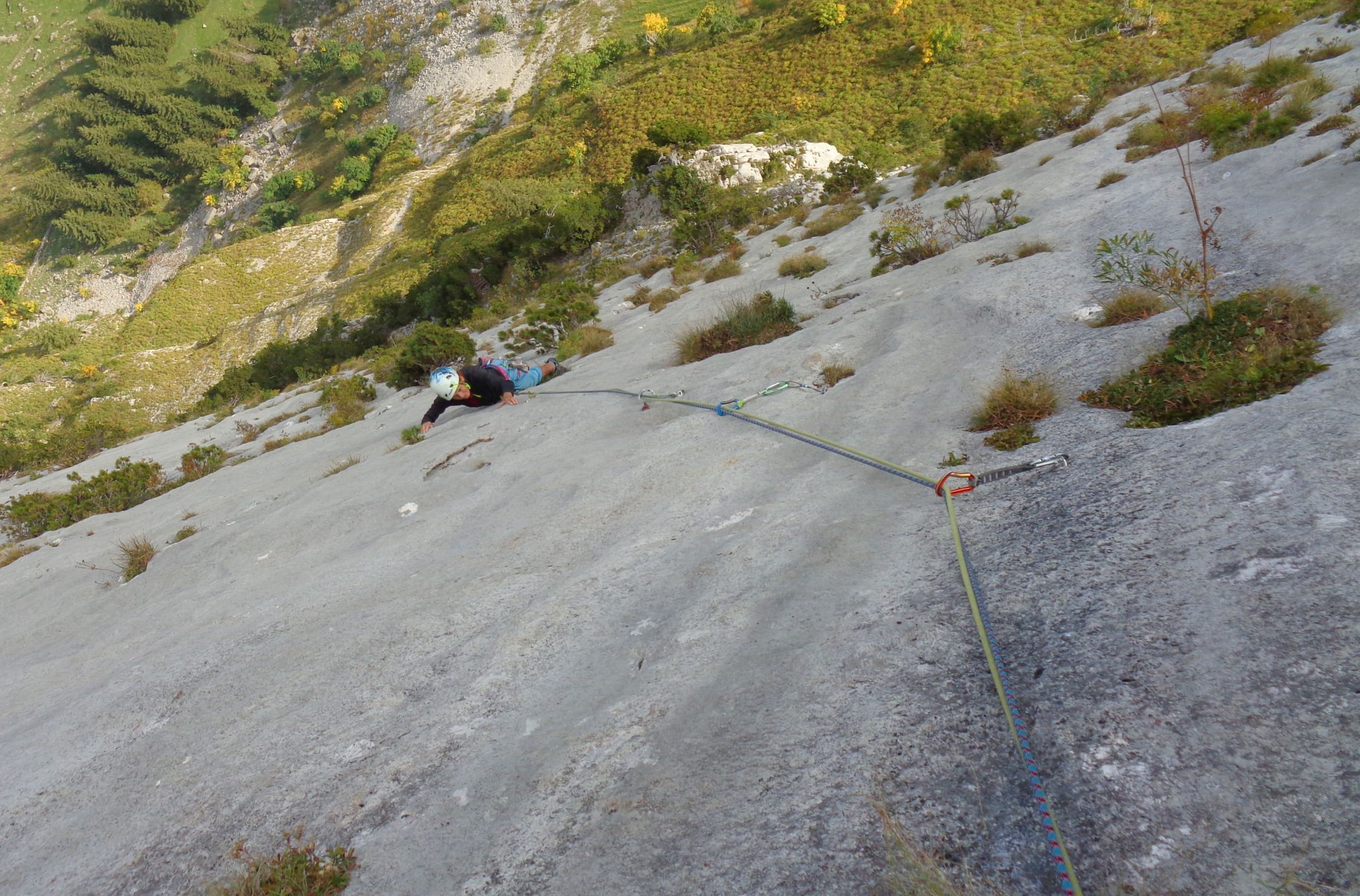 SL5 (20 m, 6/6+). Geniale Platte mit Löchern. Wirklich schön. Am Schluss gerade hoch auf das große Querband, von dem die Latschen runterhängen. Auf keinen Fall die R Variante nehmen (schlecht gesichert, am Schluss kein richtiger Stand und brüchig). Der linke Stand ist OK (1 Bh und eine sehr alte Schlinge), aber nach so einer schönen Tour etwas spärlich). Man kann zur Vertrauensbildung L und R zwei gute Cams legen, während der erste abseilt.