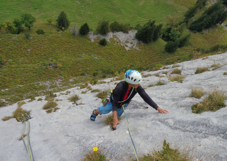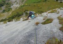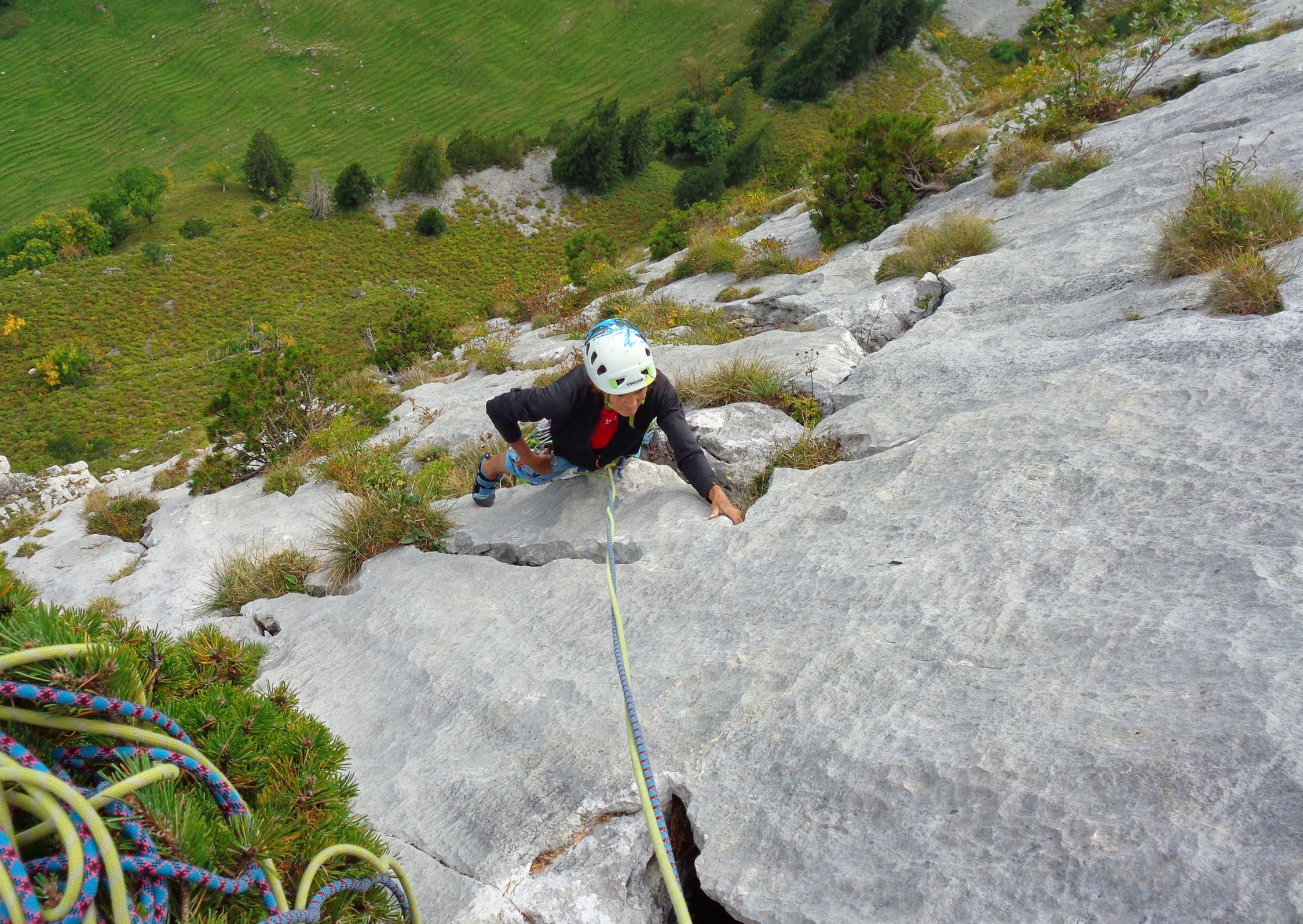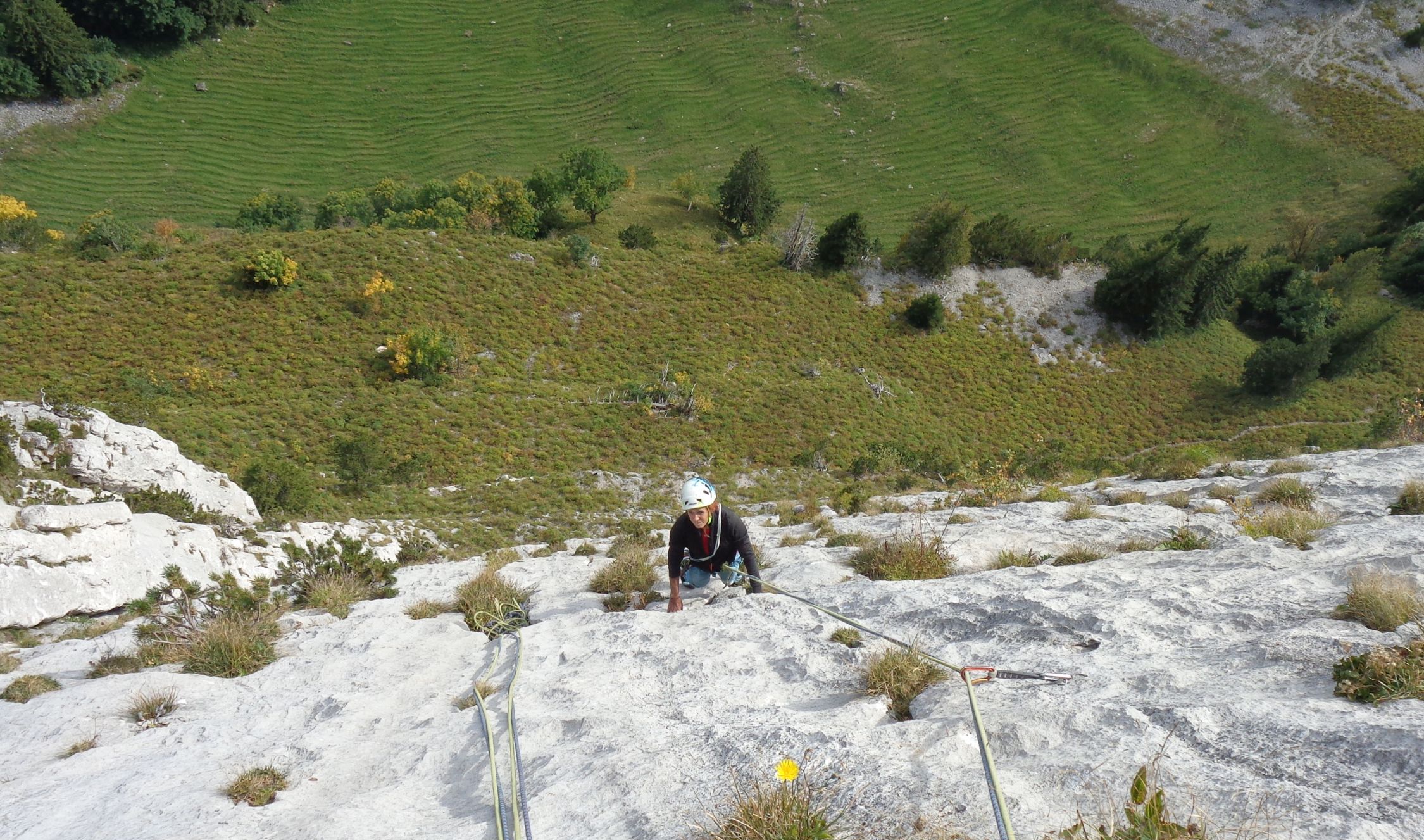 SL5 (20 m, 6/6+). Geniale Platte mit Löchern. Wirklich schön. Am Schluss gerade hoch auf das große Querband, von dem die Latschen runterhängen. Auf keinen Fall die R Variante nehmen (schlecht gesichert, am Schluss kein richtiger Stand und brüchig). Der linke Stand ist OK (1 Bh und eine sehr alte Schlinge), aber nach so einer schönen Tour etwas spärlich). Man kann zur Vertrauensbildung L und R zwei gute Cams legen, während der erste abseilt.