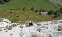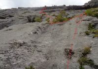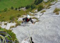 Abstieg: Man seilt ca. 45 m über die letzten zwei SL ab (fast gerade runter, nicht problematisch). Danach dann SL-weise der Route entlang nach unten. Mit 60 m Seil kann man SL2+3 zusammenfassen, mit 50er nicht!