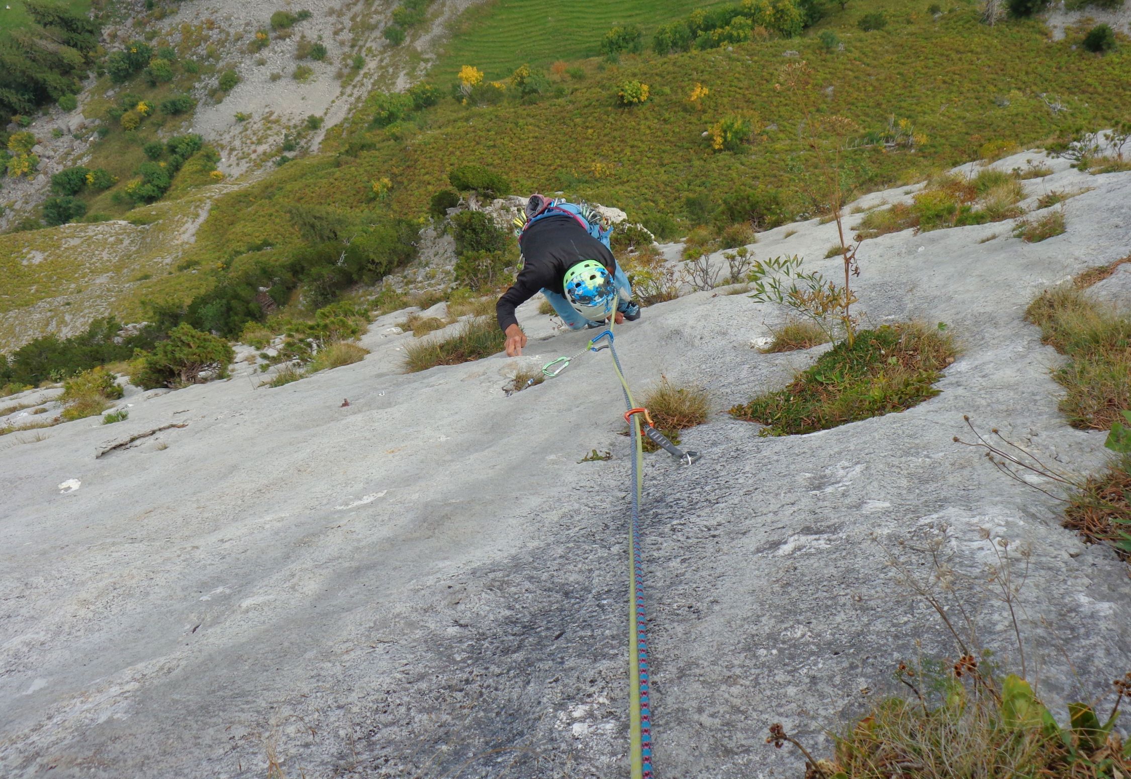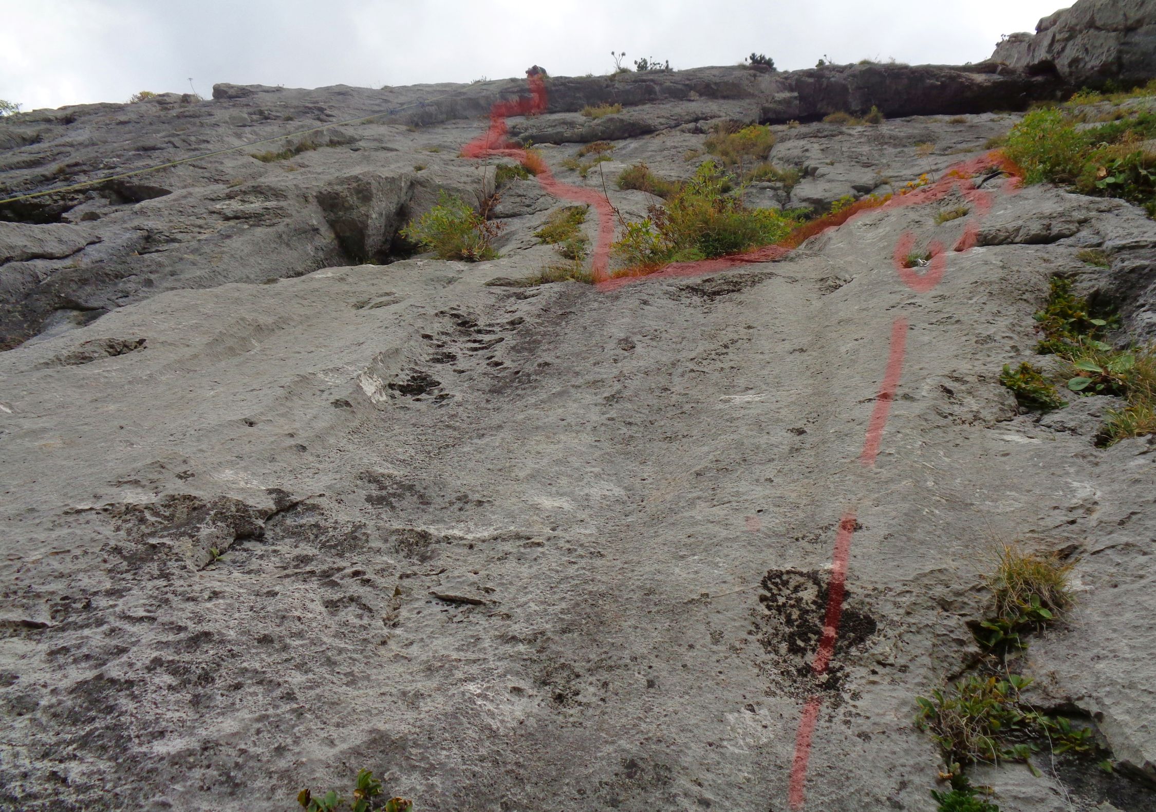 SL2 (35 m, 6/6+): Schräg nach R halten. Ein Bh ist für die meisten 10-20 cm zu hoch gebohrt, kann erst nach Überwindung der Stelle geclippt werden (evtl auch in anderer Seillänge? Fällt sicher auf). Man kann davor einen Cam legen. Jedenfalls danach nach oben: man hält auf den großen Wulst zu, in dem ein Bh mit Maillon steckt (crux, mit weitem, aber sehr schönem Move zu Schuppe). Danach leicht L haltend zu Stand.