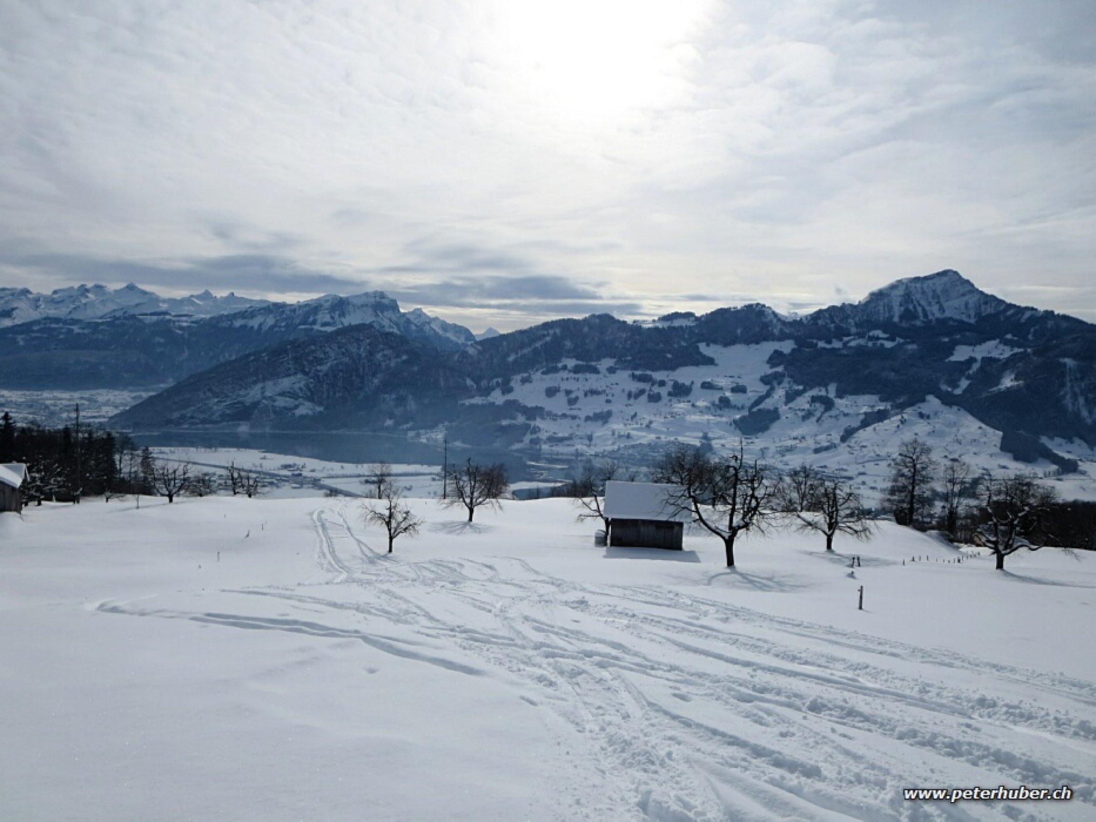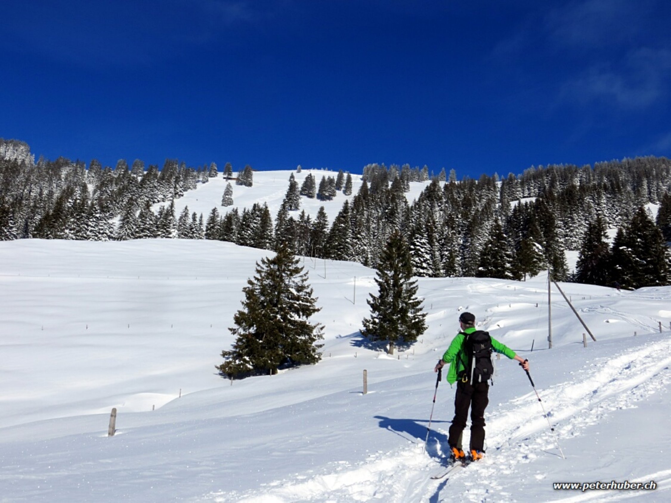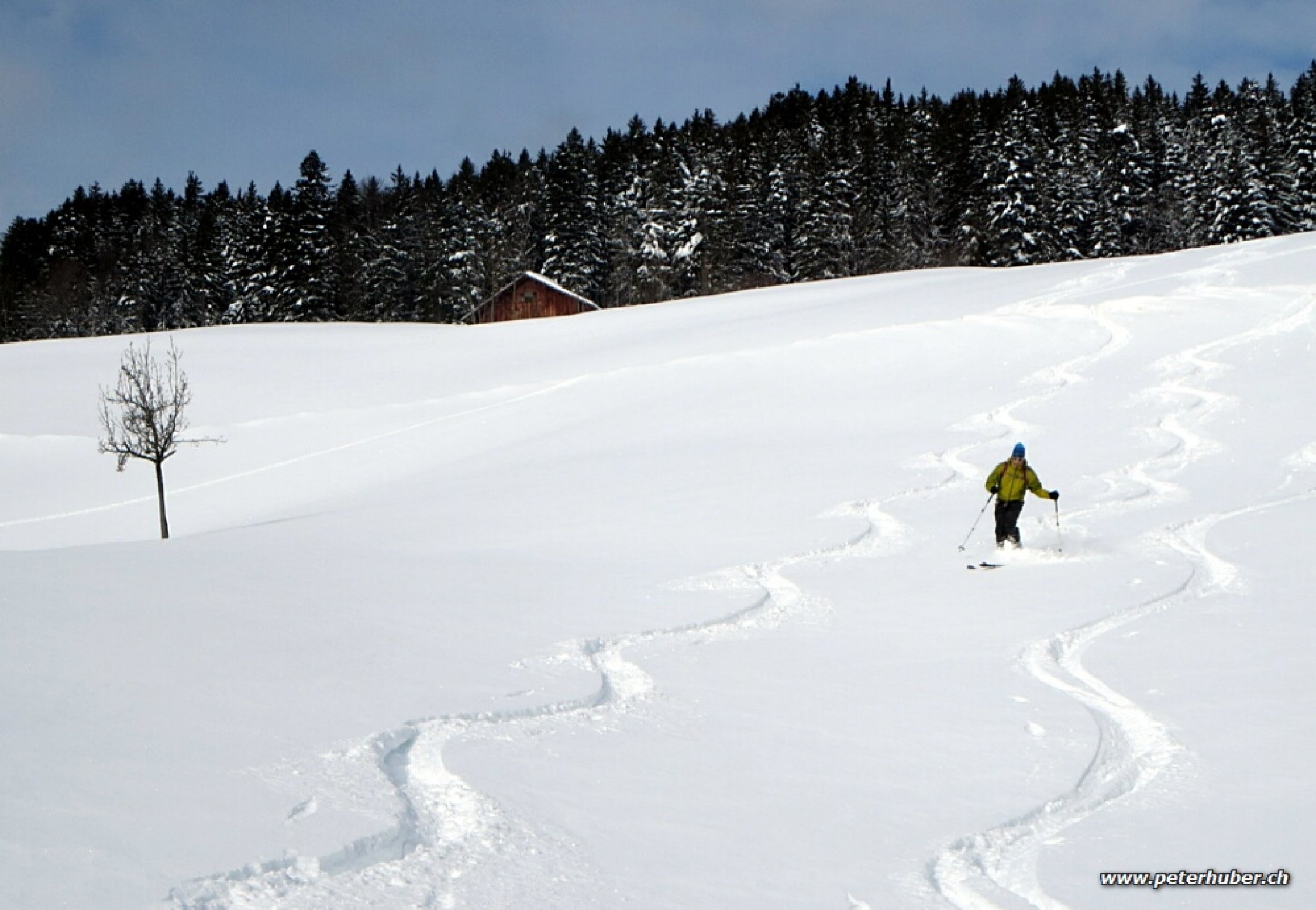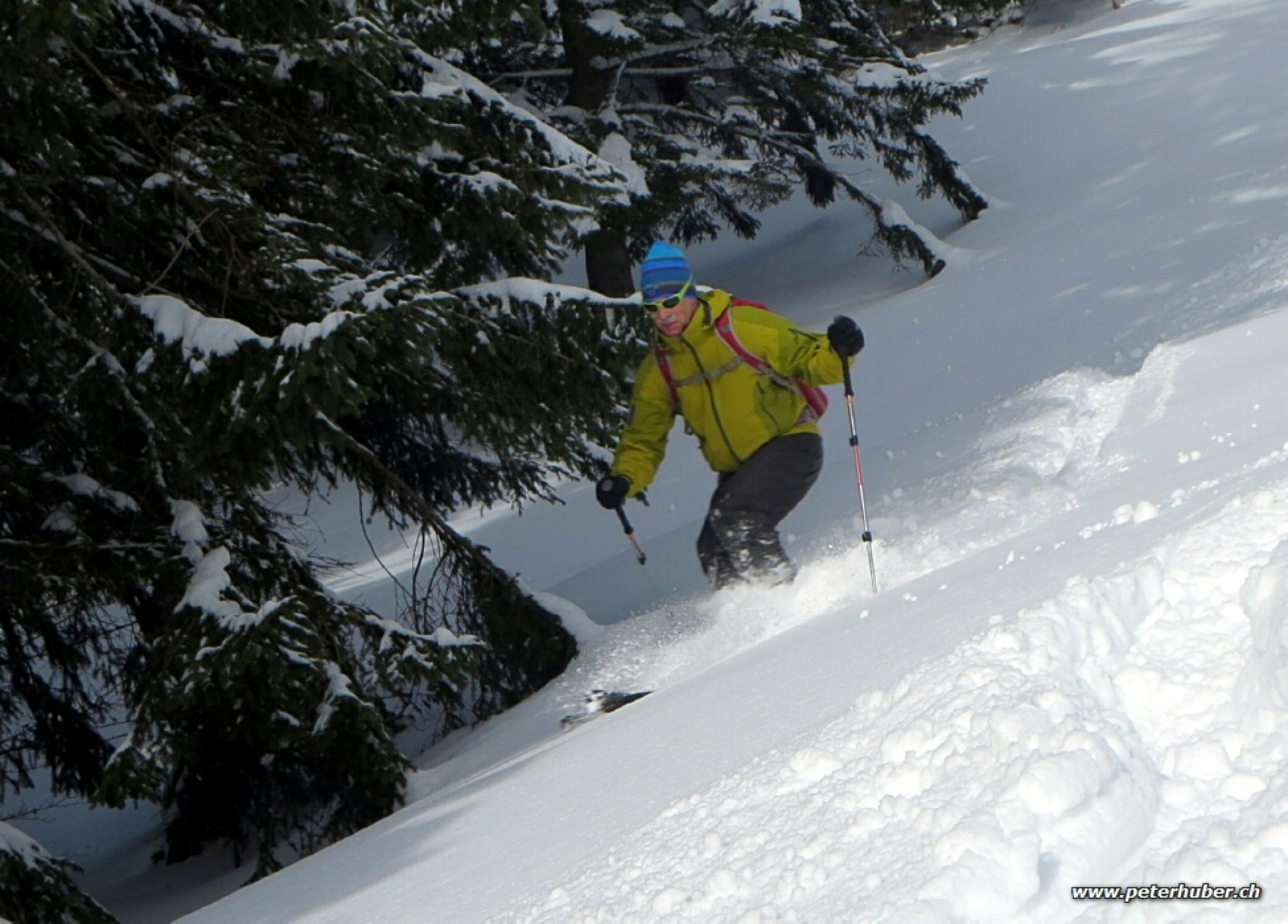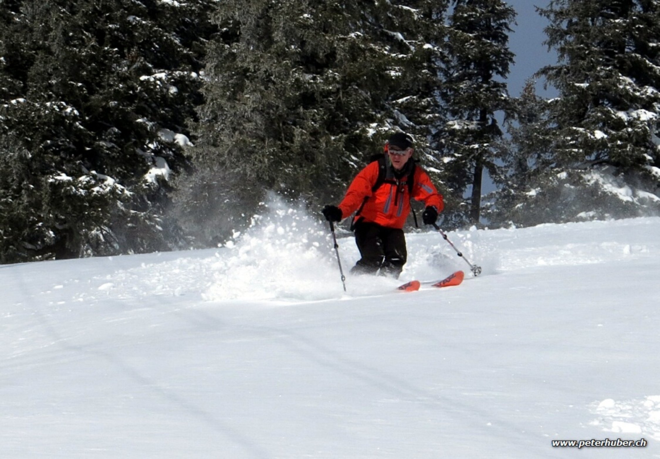 Zuerst strahlend blau, später milchige Sonne. Eher warm. Unten hat es zirka 5 cm Neuschnee, oben bis 20 cm. Eine Unterlage ist praktisch durchgehend vorhanden. In tiefen Lagen hats eine Bruchharstschicht drin. Für die Abfahrt sehr gute Verhältnisse, nur ganz unten wurde der Schnee schwer.