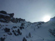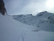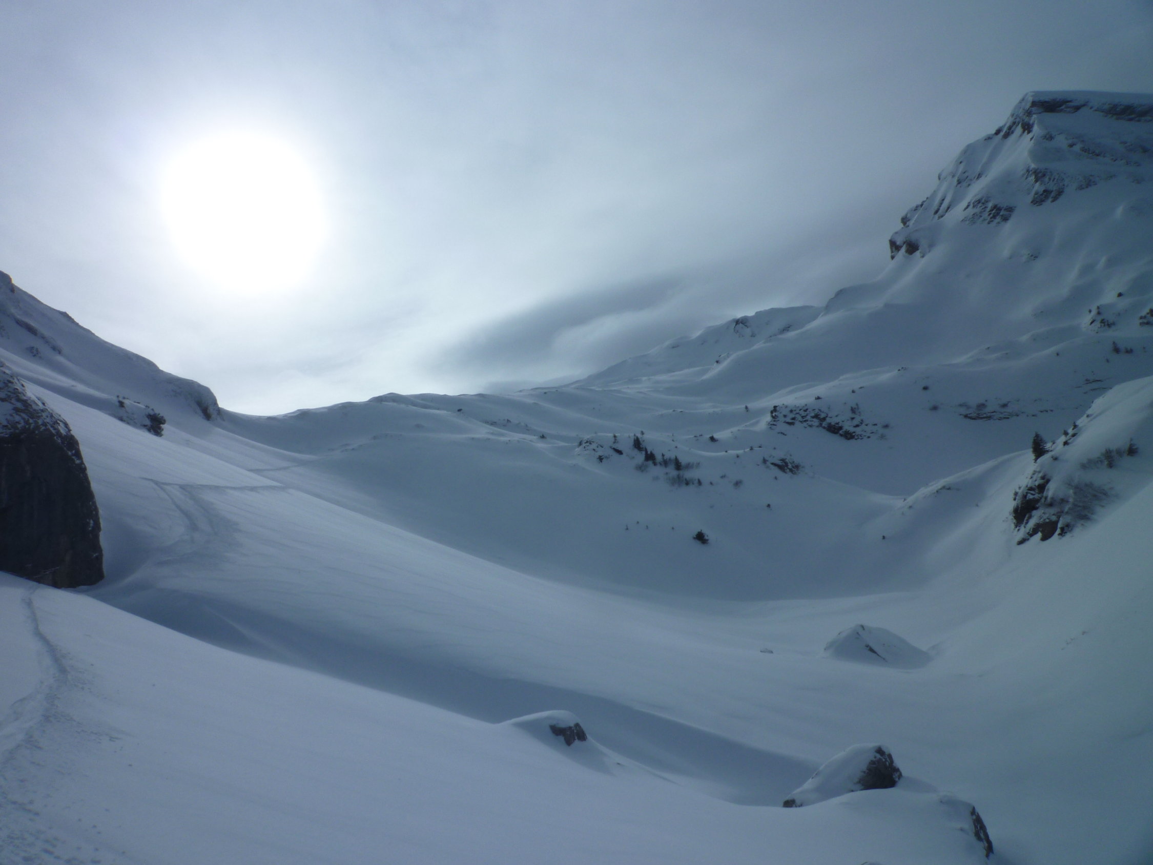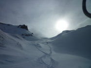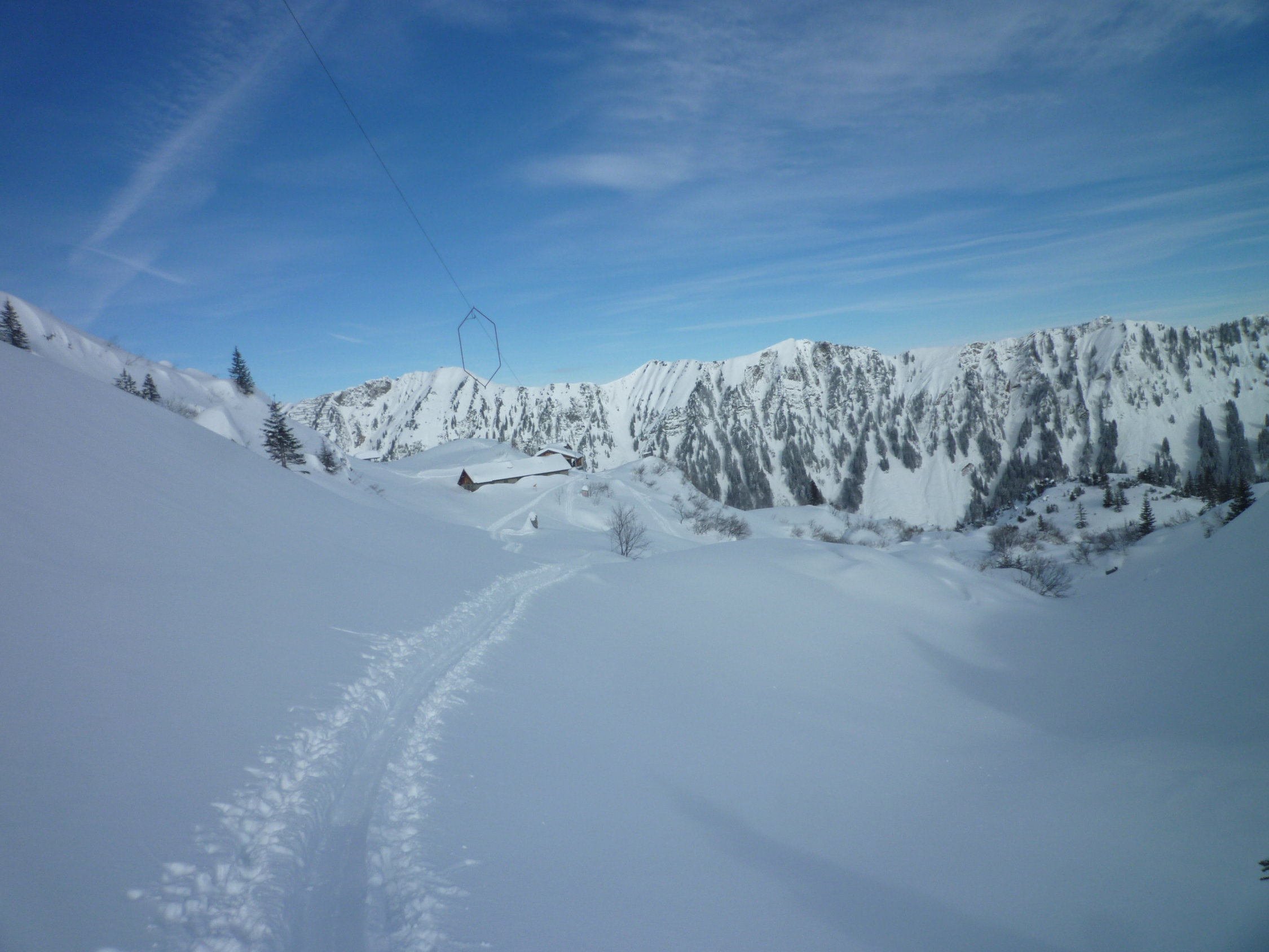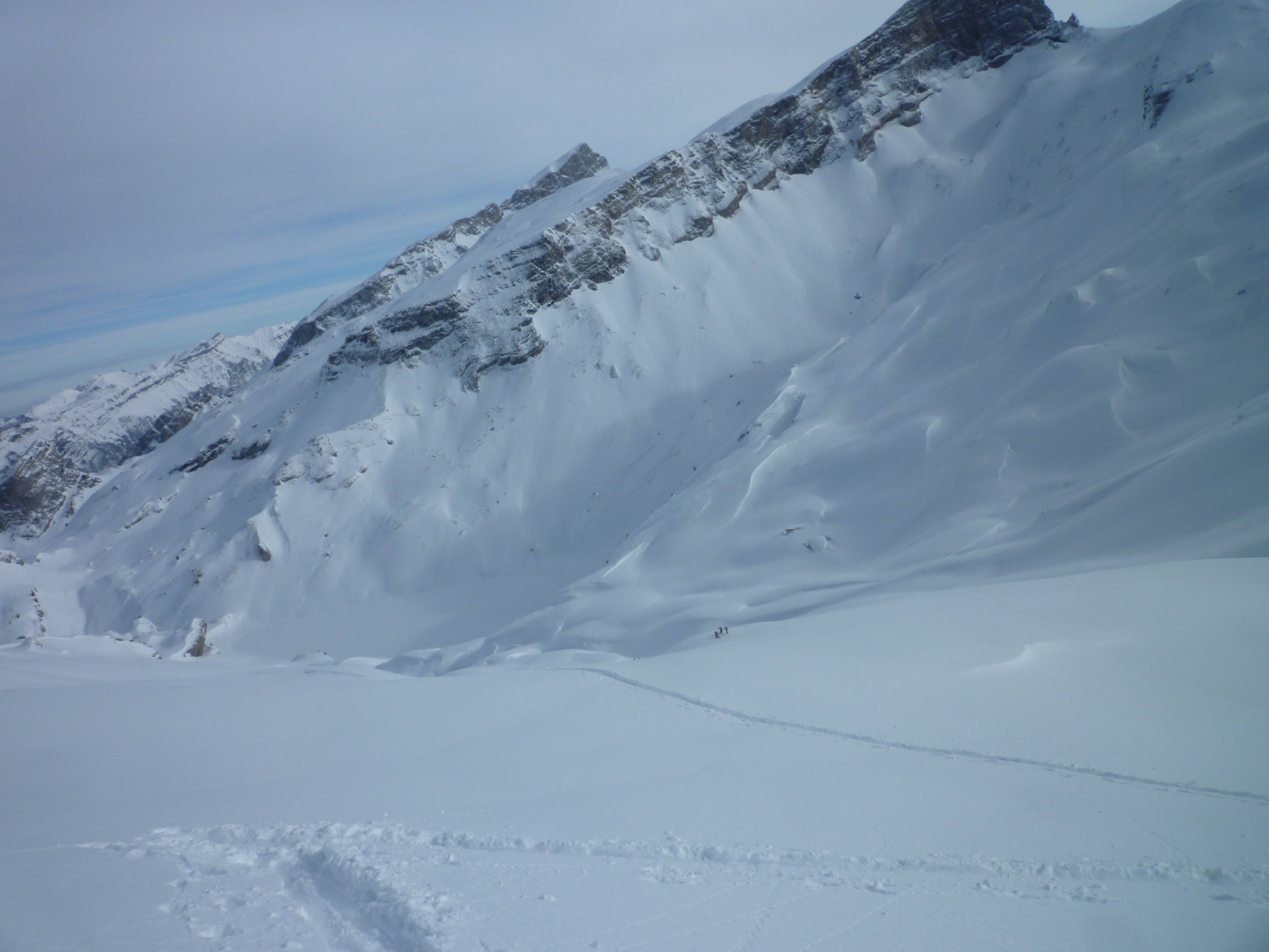 An den oberen Hängen der Abfahrt hängt nicht mehr die ganze Ladung Schnee drin, so dass uns nichts auf den Kopf gefallen ist. Grundsätzlich besteht aber schon noch die Möglichkeit Schneebretter auszulösen, da einige Windverfrachtungen deutlich zu erkennen waren.