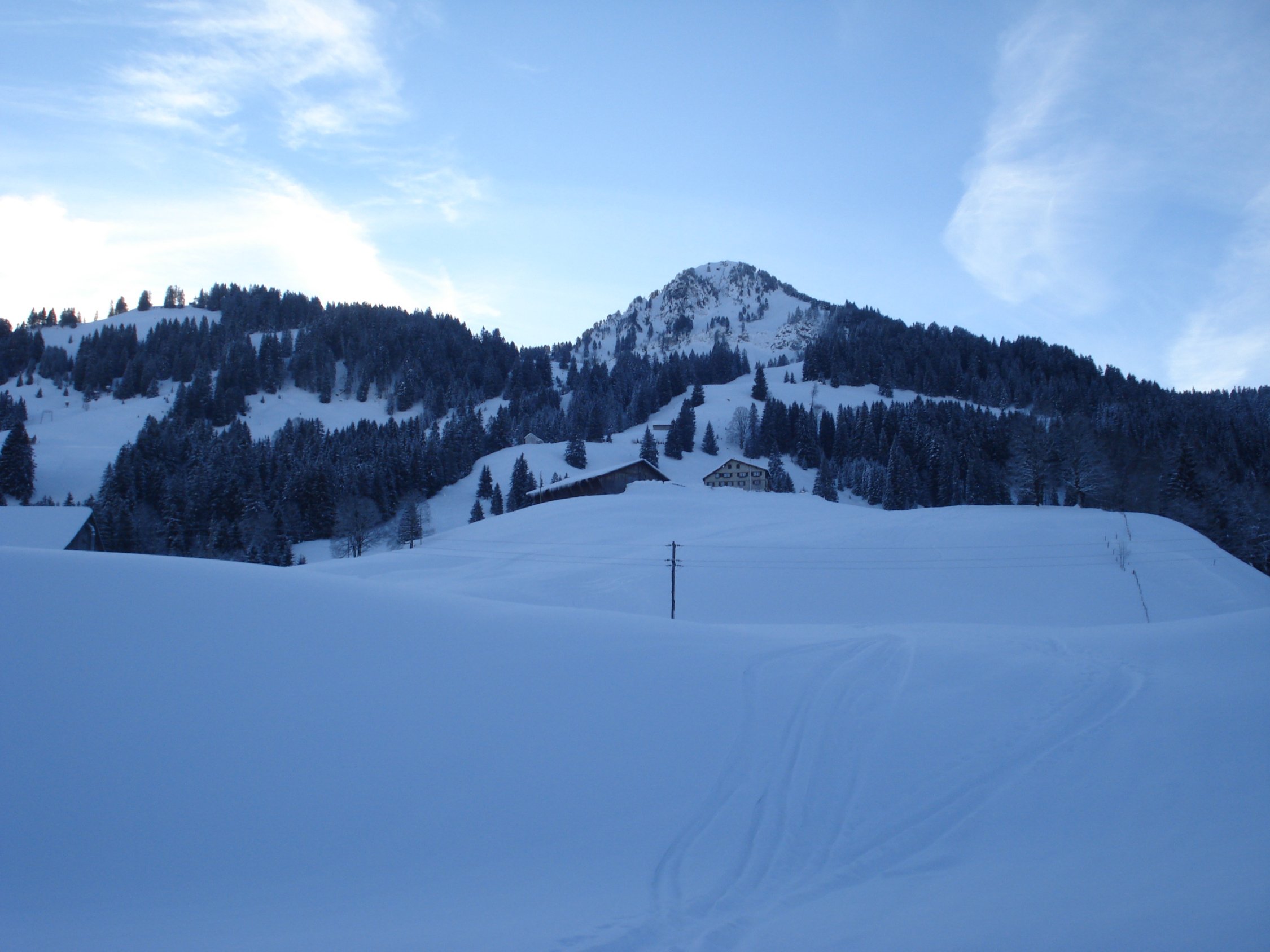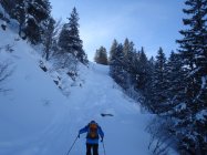 Rund 20 bis 30 Zentimeter Neuschnee auf teilweise fester Schneeunterlage. Aufstieg dank gut gelegter Spur problemlos. Lediglich der Schlussaufstieg war mit dem Splittboard stellenweise nicht ganz einfach, aber weil weitgehend ungefährlich gut machbar.