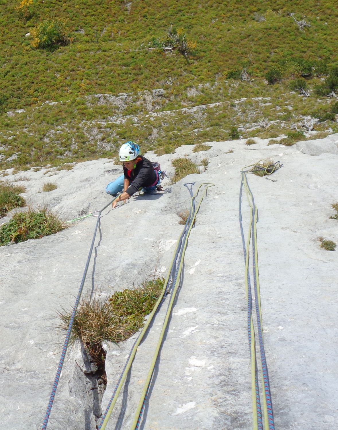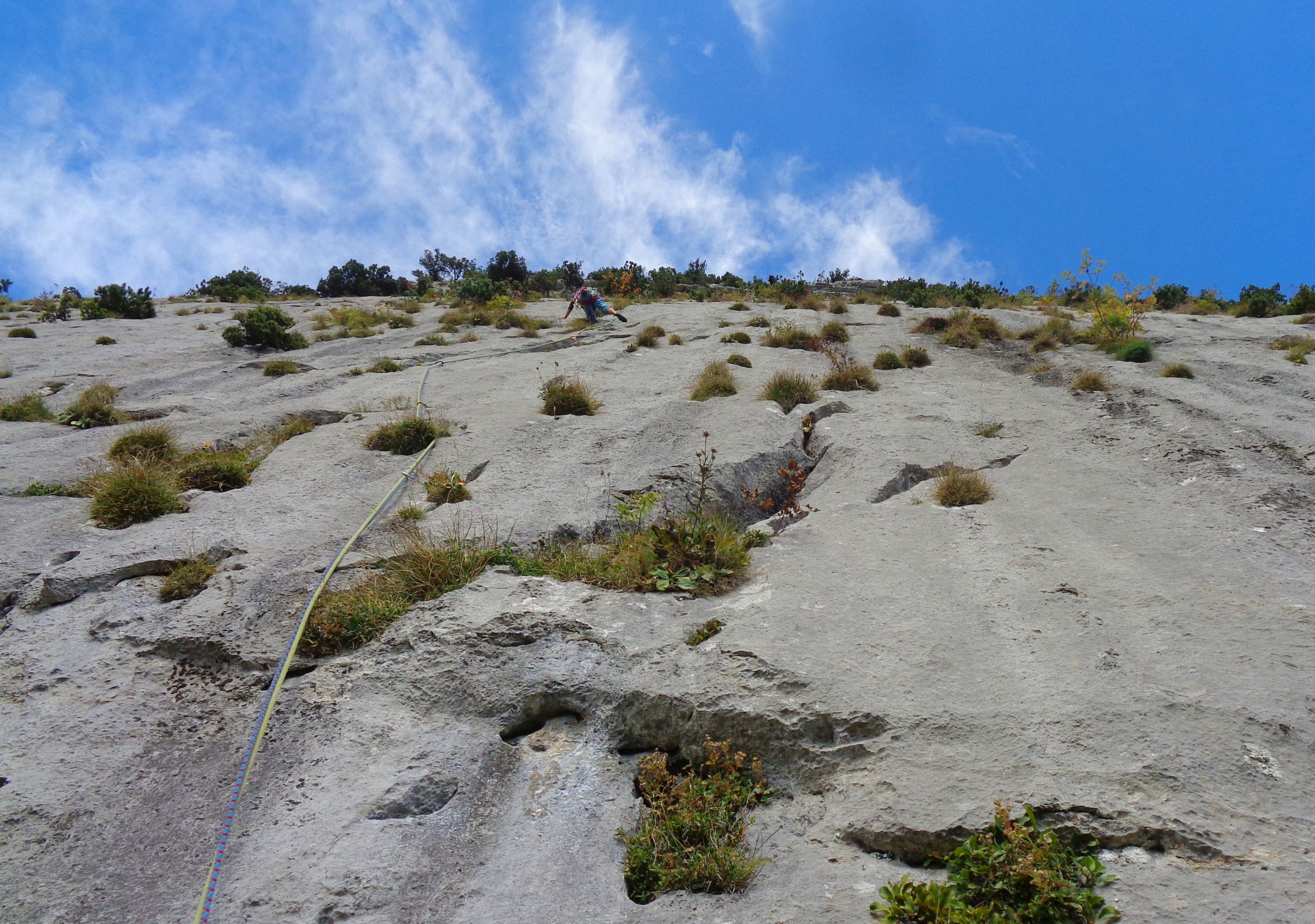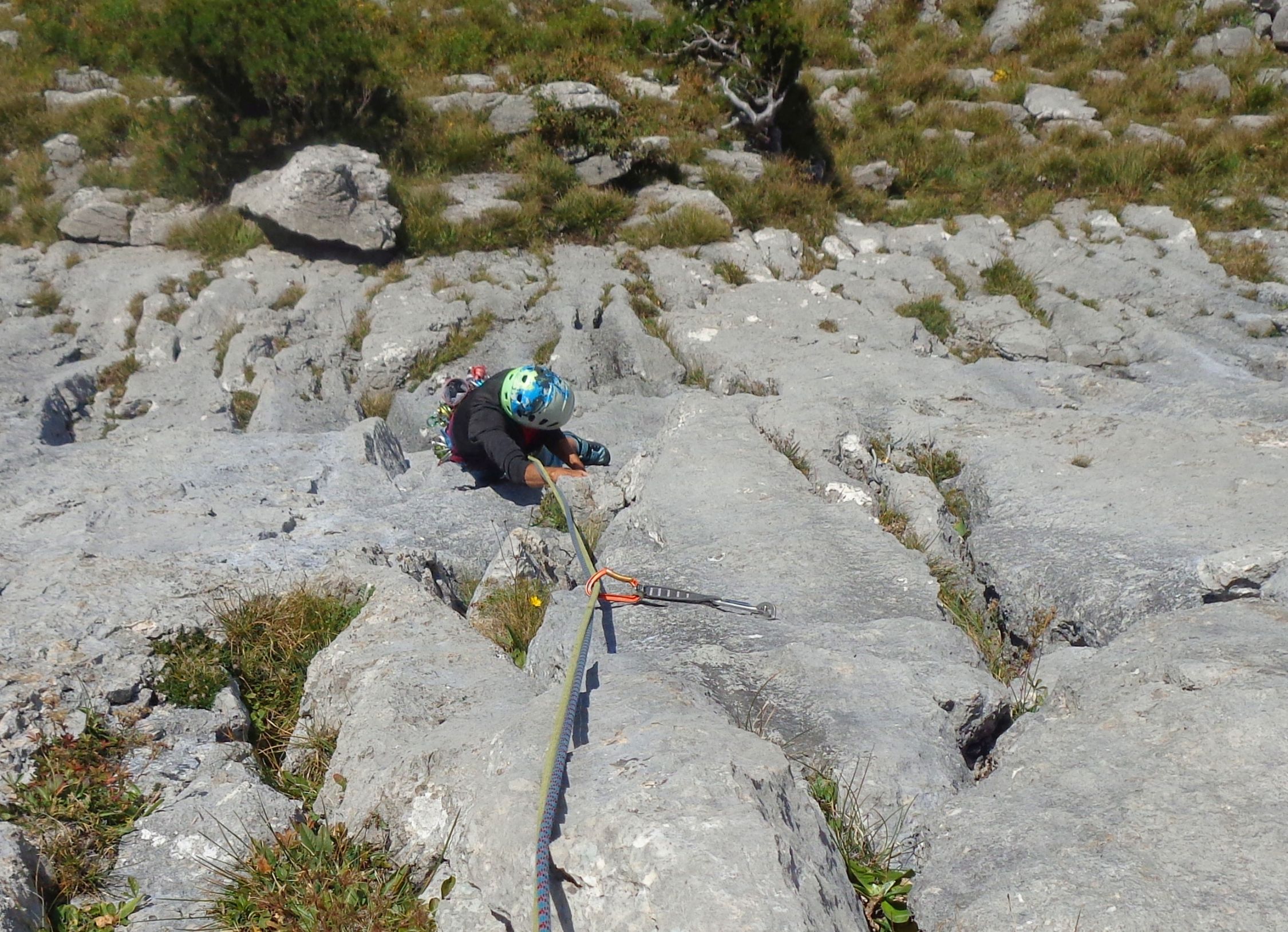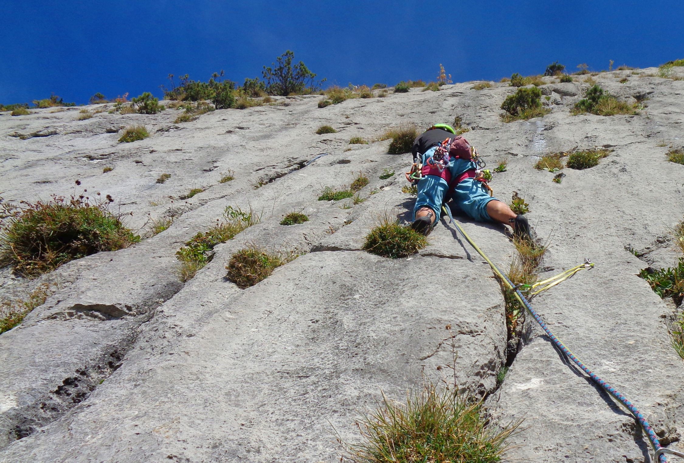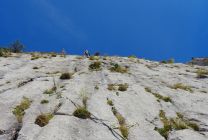 SL2: die Routenführung ist ausgeprägter S-förmig als man aus dem Topo schliessen könnte. Bei der Rampe nach R eher höher halten und eine Schlinge um die Latsche legen. SL 4 ist die Königslänge. Abwechslungsreich, auch mit ein paar Plattenstellen. Bei Querungen tief halten!