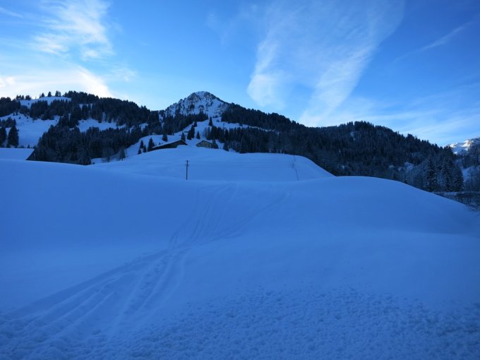 Start um 9:10 bei schönem Wetter und -7°C. Ziel schon ersichtlich… Aufstiegsspur Anfangs zugeschneit, (da wir die ersten waren). Oberhalb ca. 1300 Meter kreuzten andere Tourengänger den Weg von Osten; dann besser gespurt. Bis zum Gipfel gute Spur vorgefunden.