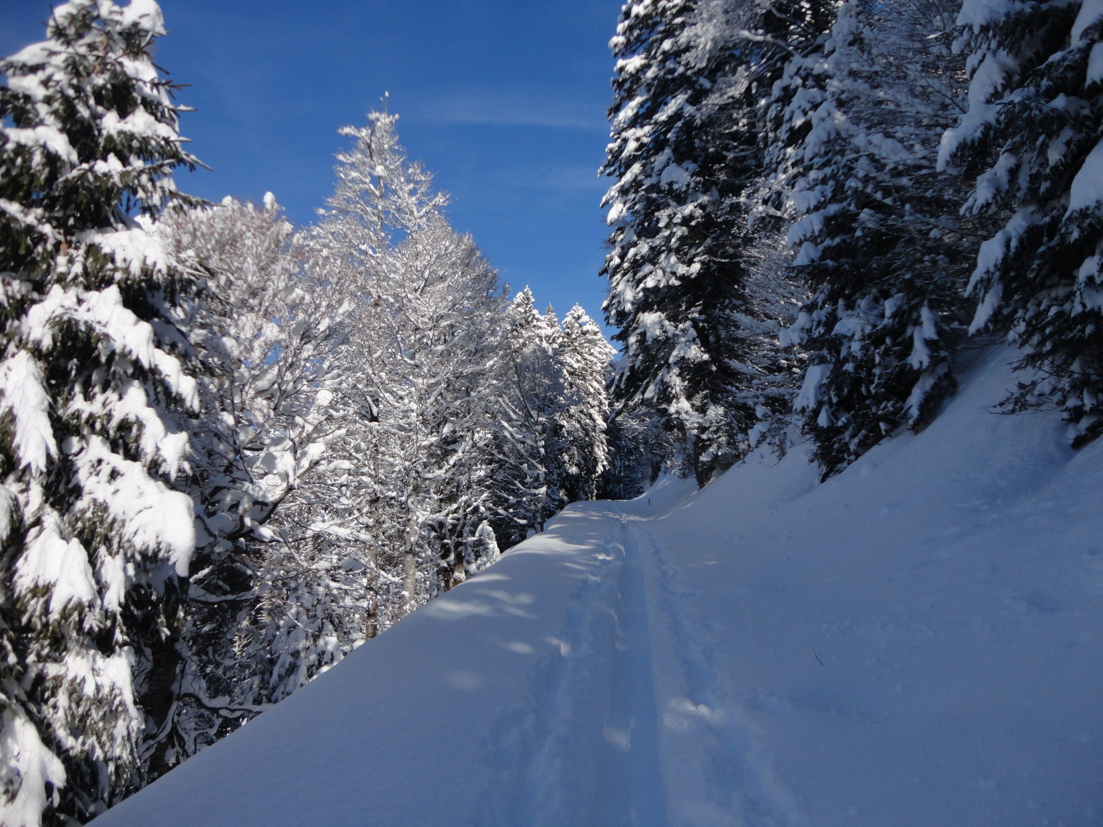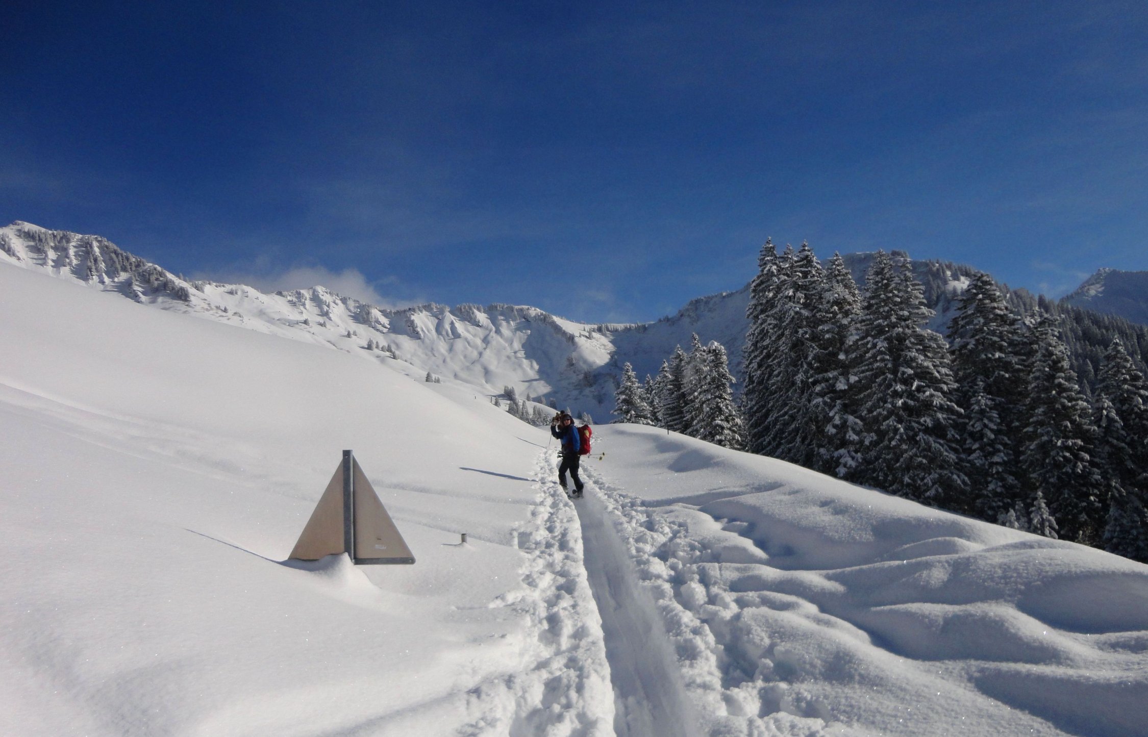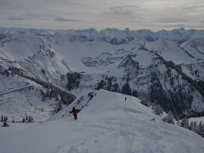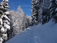 Trotz der durch die Lawinenlage eingeschränkten Tourenmöglichkeiten war relativ wenig Betrieb und daher noch viel Platz für eigene Spuren. Die südwestseitige Abfahrt durch die Waldschneisen ist stellenweise deutlich steiler als die freien Südhänge, schien uns aber durch die niedrige und windgeschützte Lage vertretbar und ist durchaus lohnend.