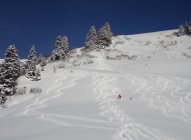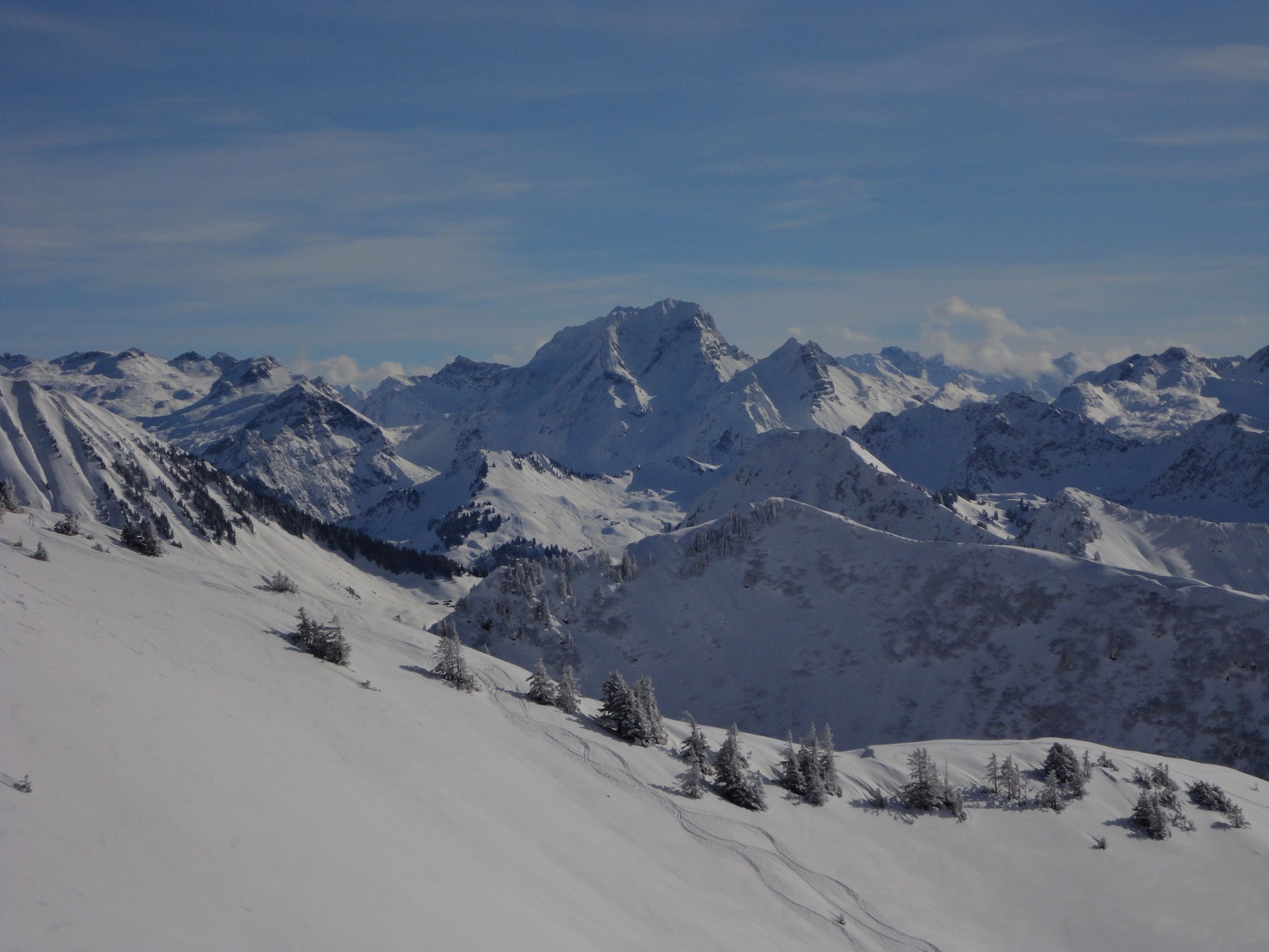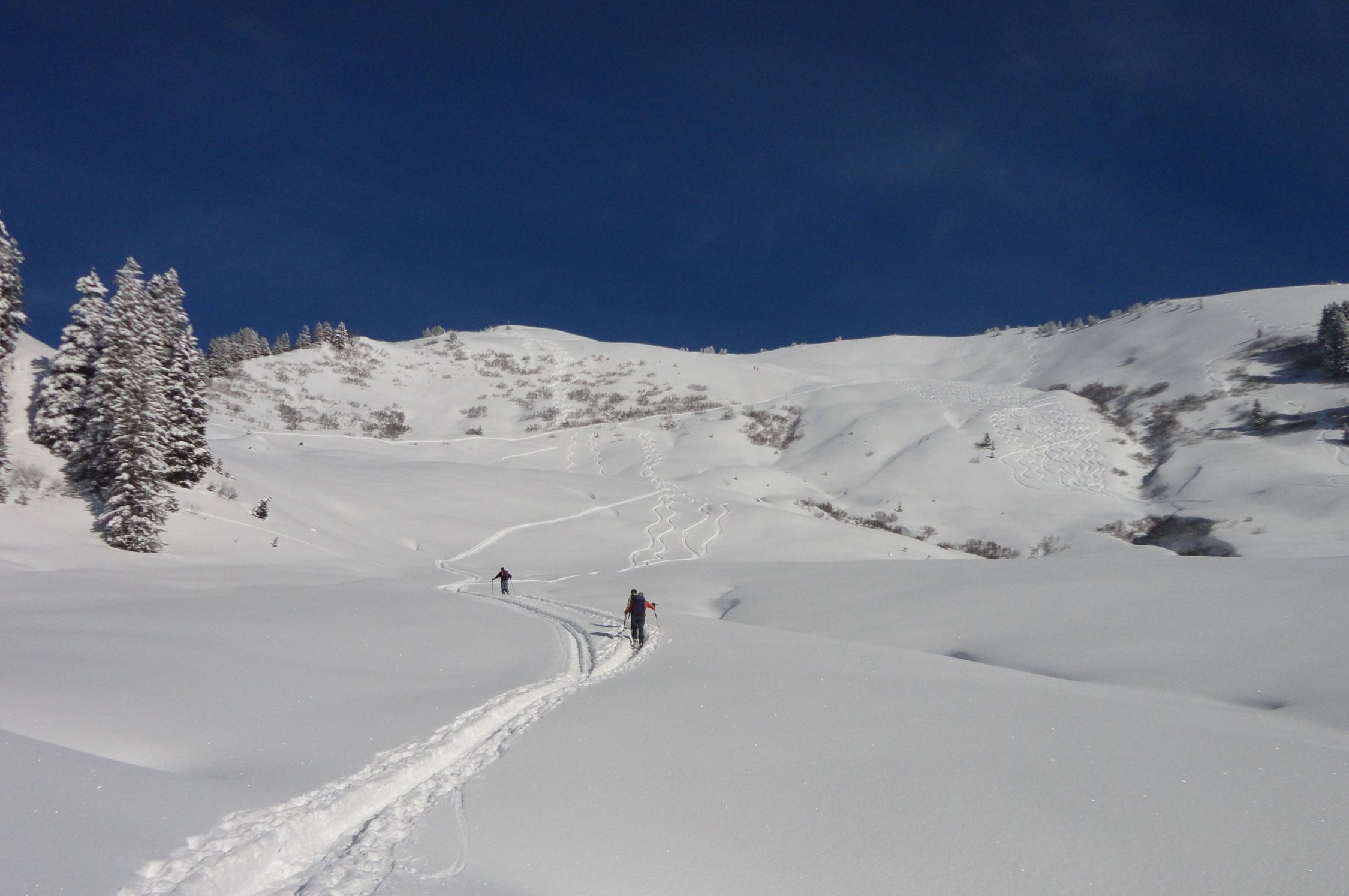 Beste Abfahrtsverhältnisse. 30-40 cm unverblasener Pulver und Gelände gerade so steil, dass noch schöne Schwünge möglich waren. Weiter unten und später am Tag wurde der Pulver schon etwas schwerer, war aber immer noch gut zu fahren.