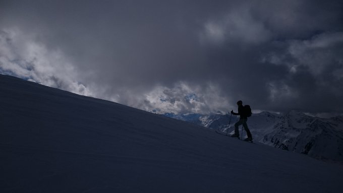 Bis zu den Almen also nur über die Forststrasse, dann mit wenig Schnee über die Wiesenhänge hinauf. Weiter oben dann mehr Schnee mit Unterlage. Ab dem Grat alles abgeblasen und teilweise pickehart.