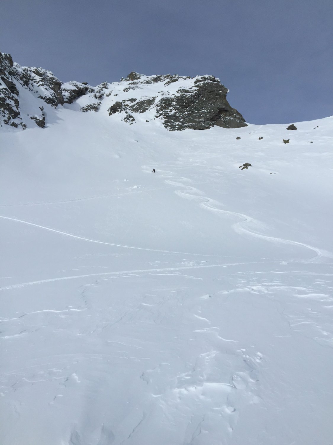 Die Abfahrt war ansprechend gut im unverspurten Pulverschnee, allerdings musste man sich im oberen Teil durch einige Winddeckel durchkämpfen.