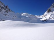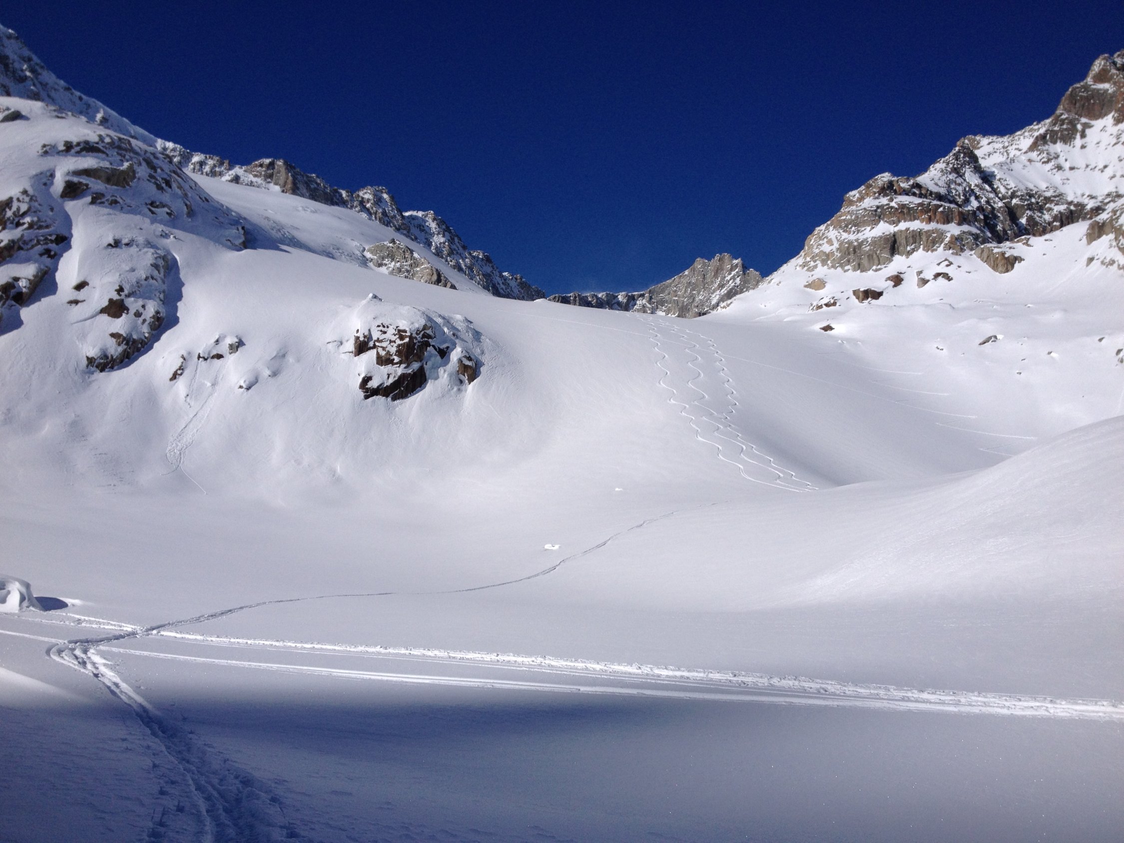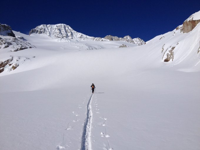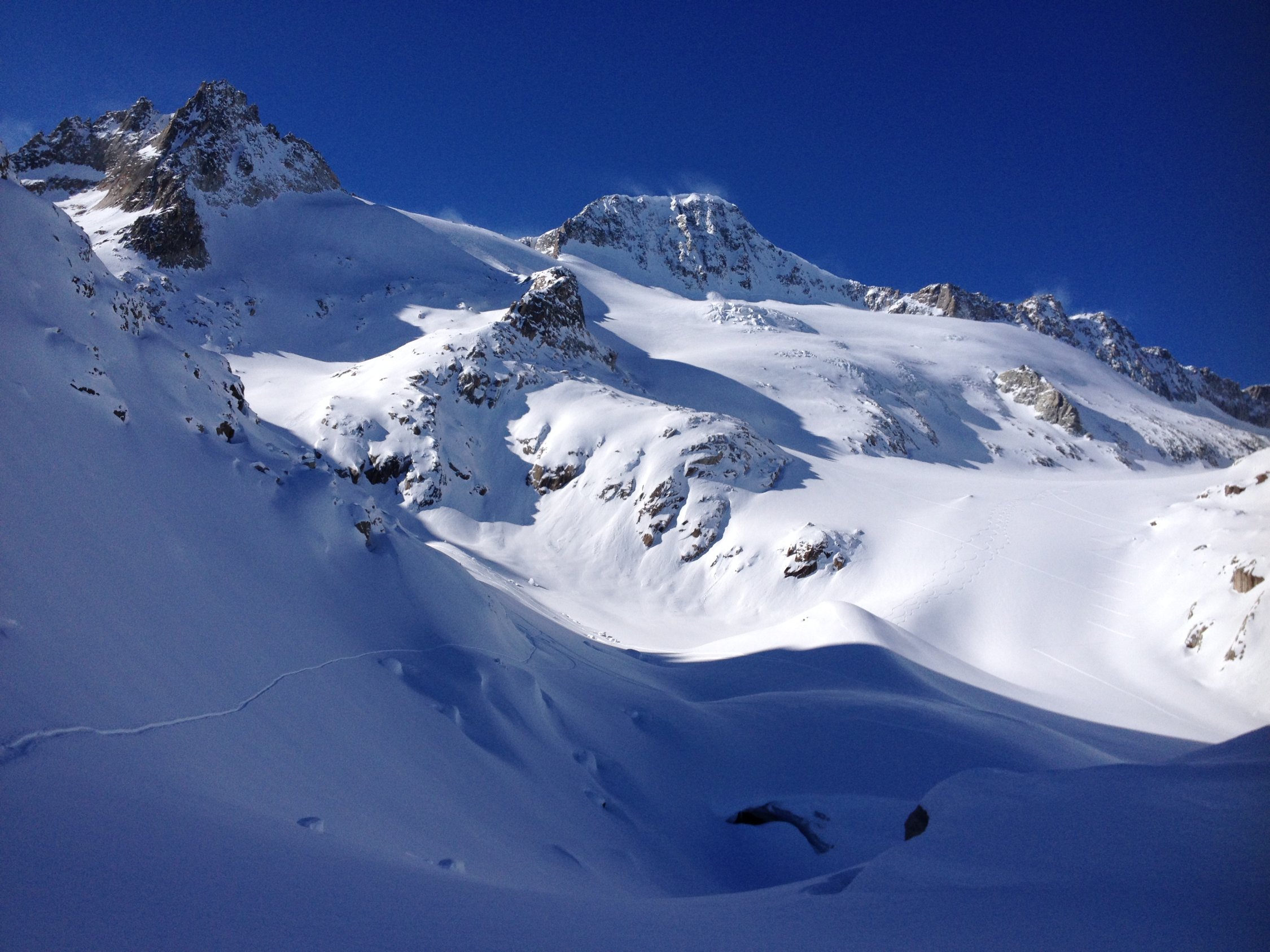 Bis Abzweig Chli Bielenhorn war gespurt, danach nicht mehr. Erster Hang den Gletscher hoch schöner unverblasener schon etwas schwerer Pow, danach zunehmend windverblasen. Der Hang unter dem Skidepot ist stark eingeblasen mit teilweise ordentlichem Deckel und darunter Schwimmschnee, daher Umkehr auf 3250m, uns war es zu heikel.