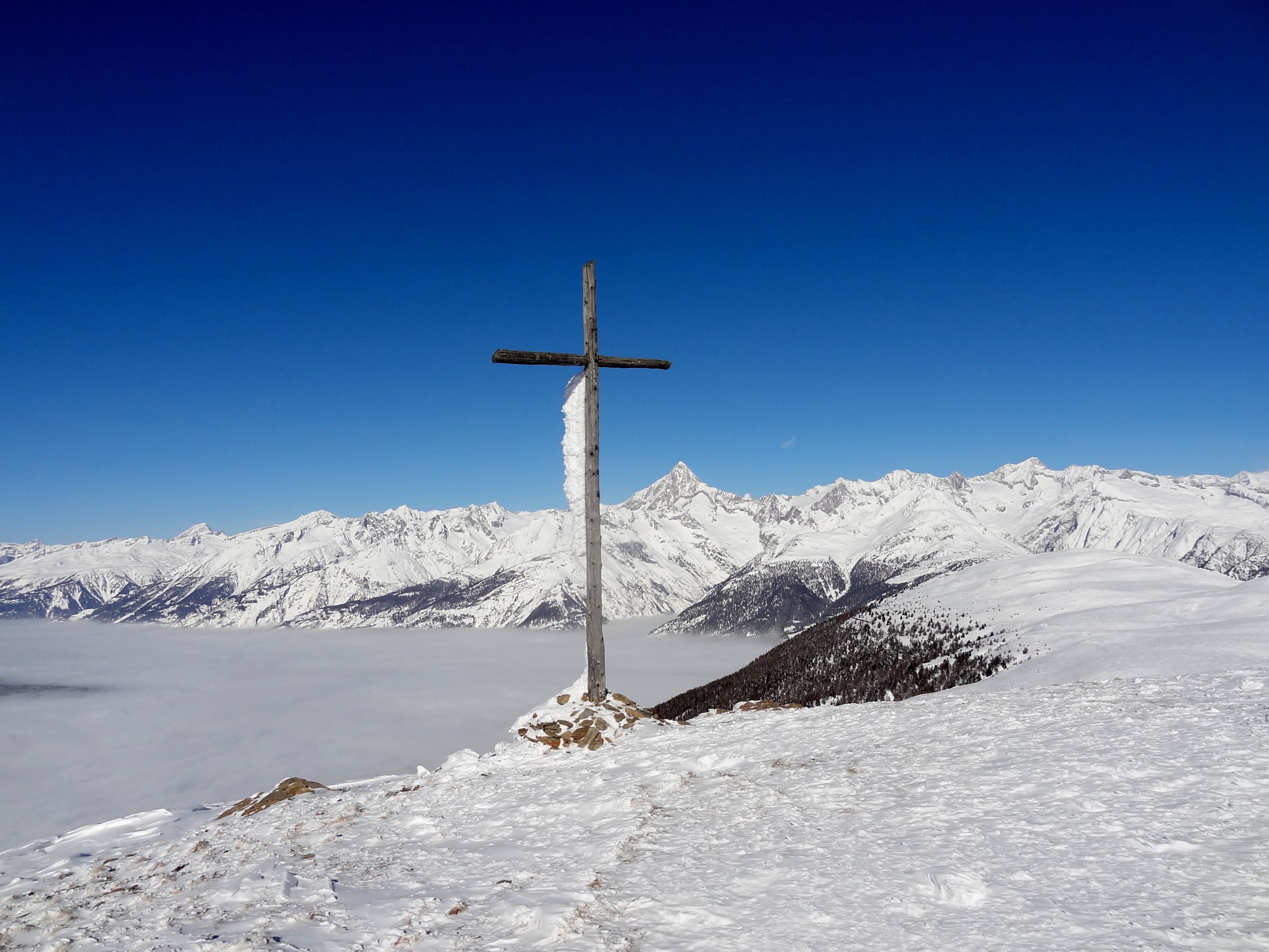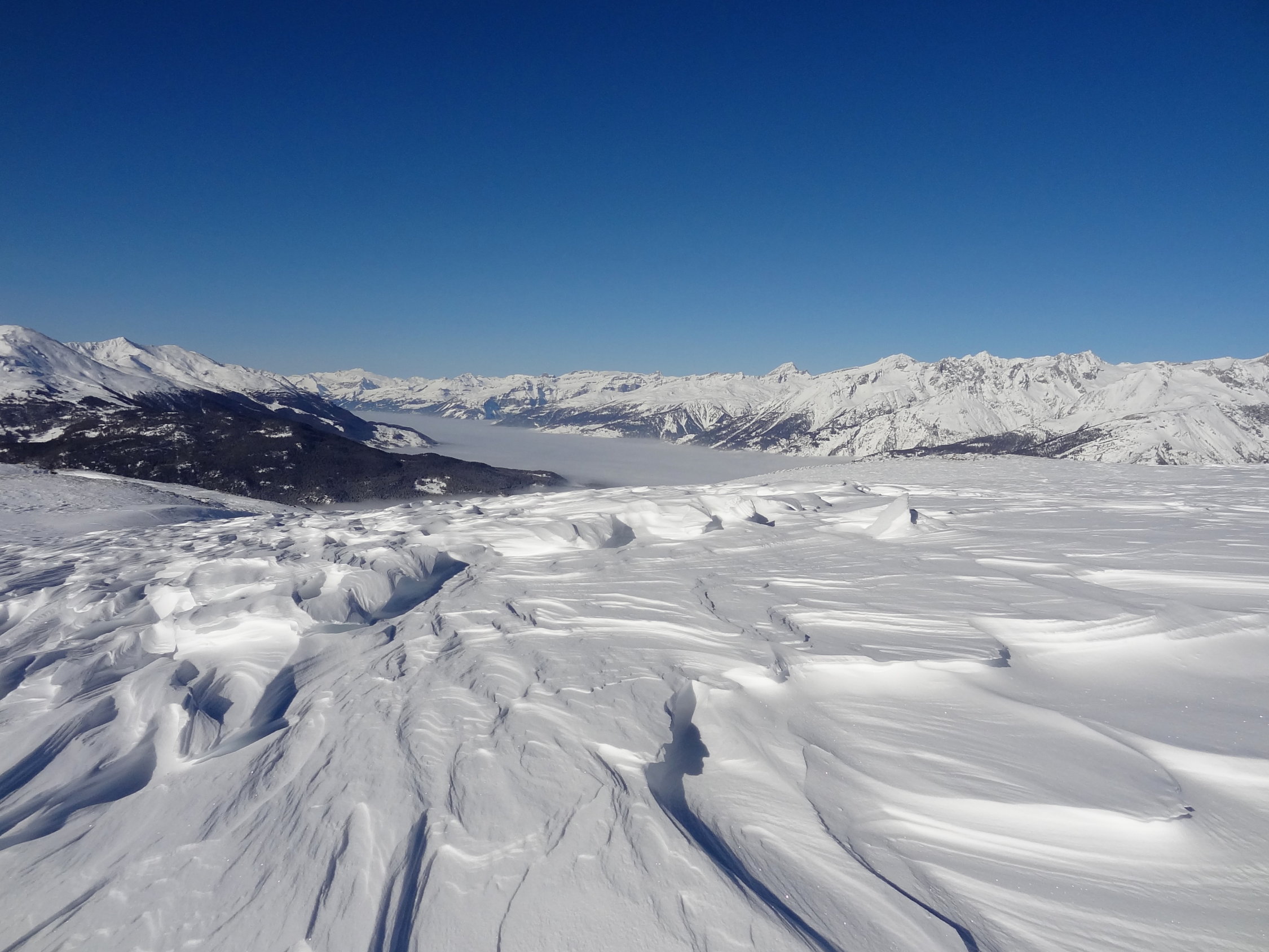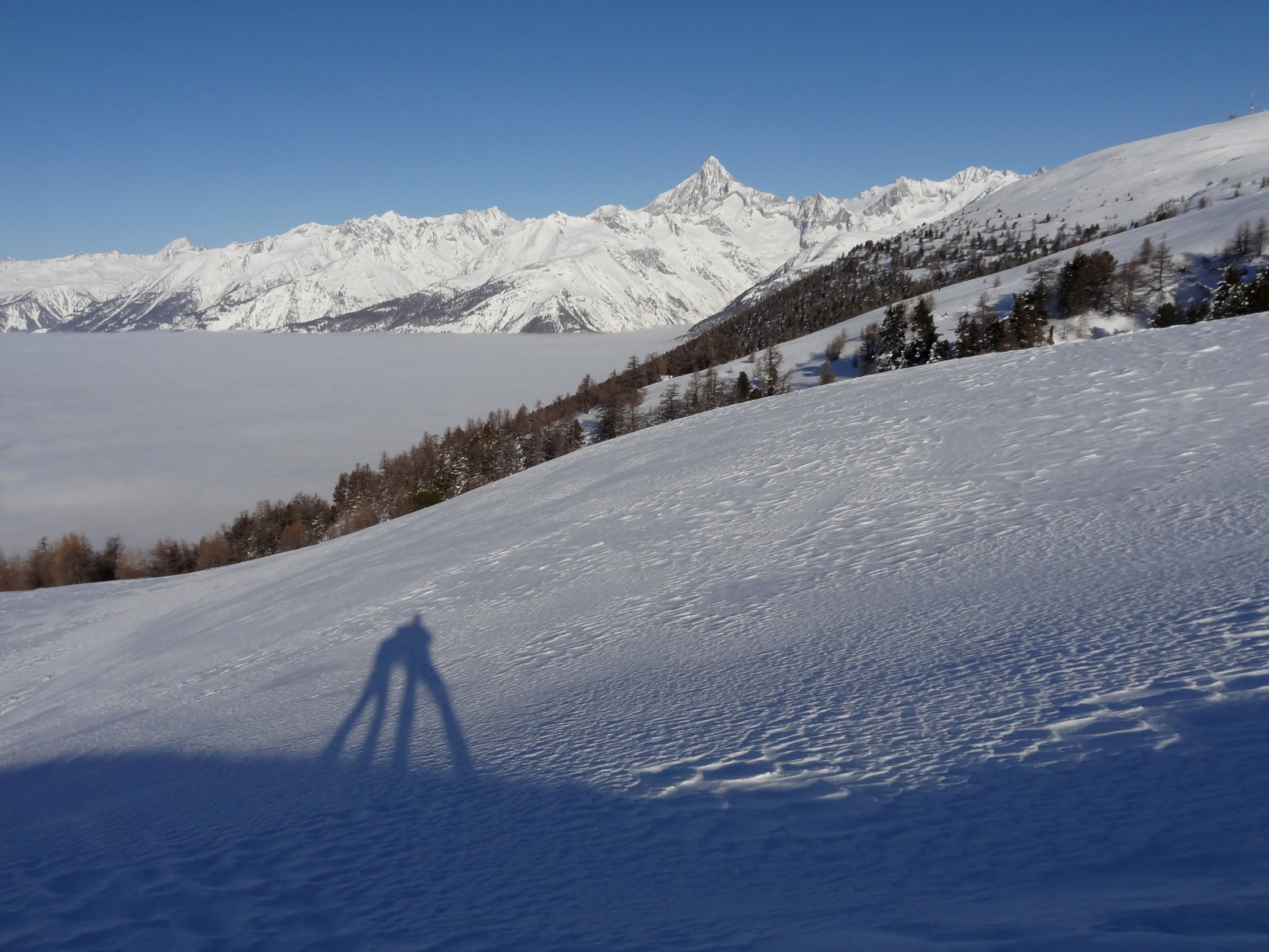Will man oder kann man, egal aus welchem Grund, keine grosse Tour machen, ist der Gibidumpass mit Rothorn oder Gibidum, eine der besten Adressen. Erleichterung durch Sessellift, bis zum Gibidum eine maschinelle Spur, eine atemberaubende Aussicht, da kann man schon sehr zufrieden sein. Das dachten wir heute auch. Das Spuren in den Schneeverfrachtungen nahmen wir, angesichts der Aussicht, gerne in Kauf. Und die wenigen Pistenfahrer verloren wir bald aus den Augen und waren allein auf dem Rothorn. Ich suchte einen "richtigen" Gipfel, aber das Rothorn scheint, auf Anfrage, einer der Buckeln zu sein, die im Grat zum Ochsenhorn sind. Ich glaube in all den Jahren Dies noch nie erlebt zu haben: eine kompakte Hochnebeldecke über das ganze Rhonetal inklusive Mattertäler und Obergoms. Visperterminen ist im Winter wie im Sommer ein Wanderparadies.