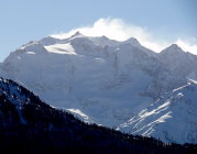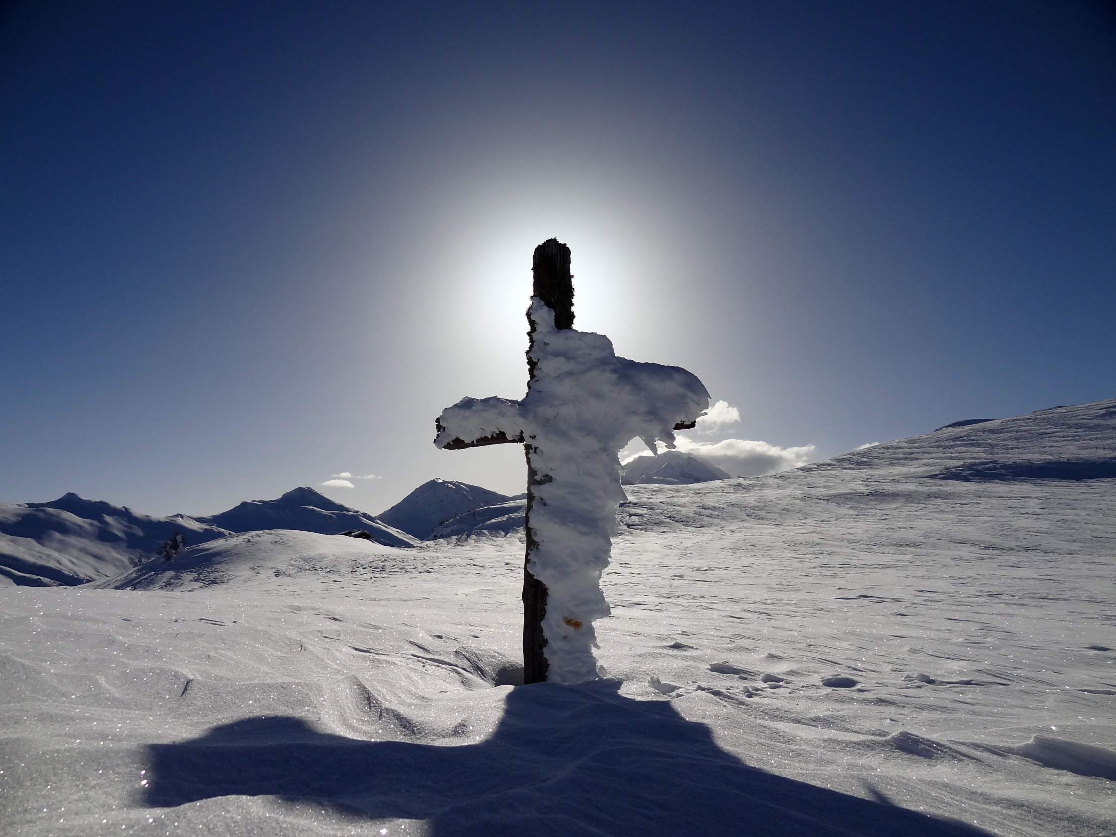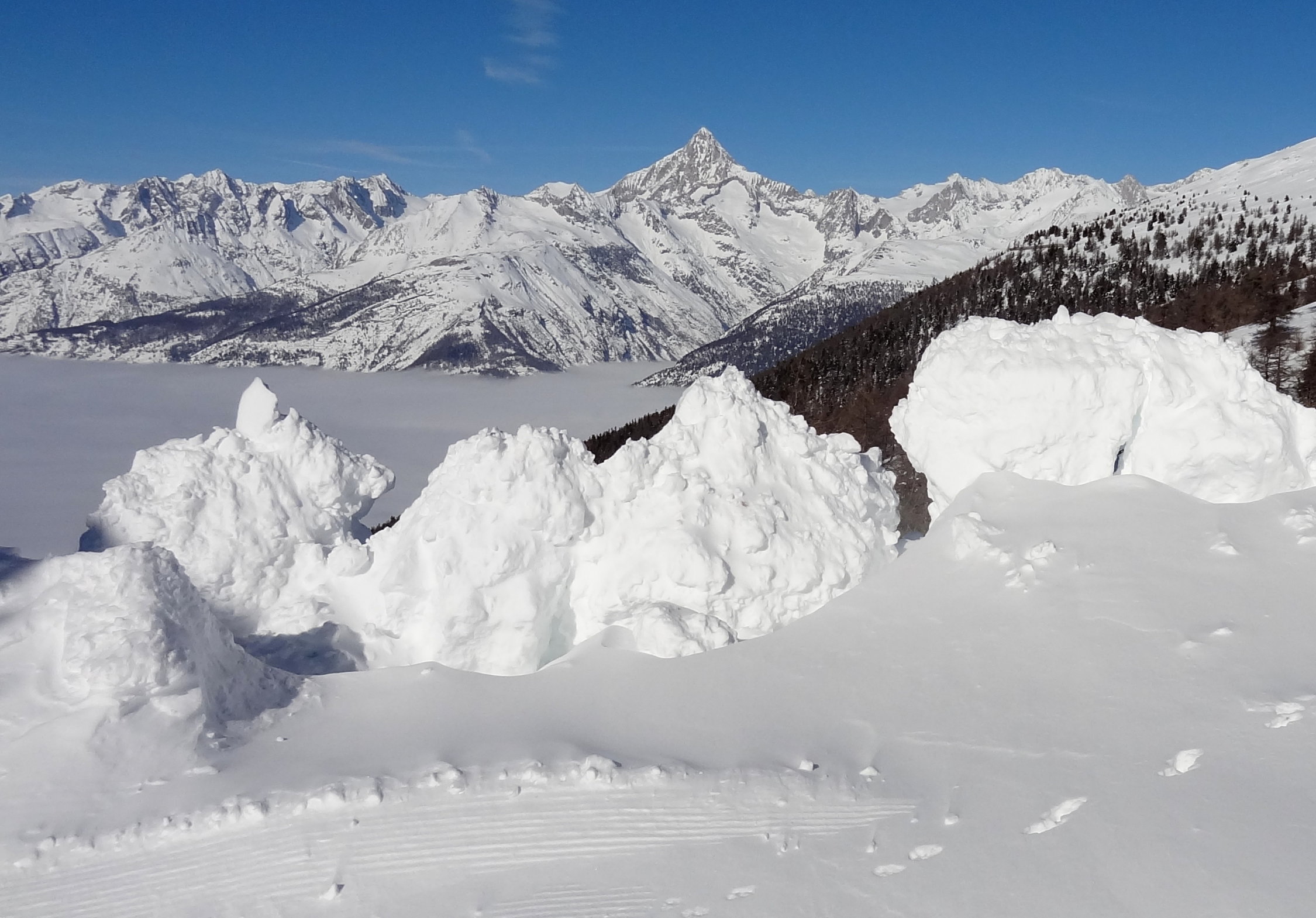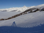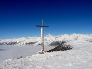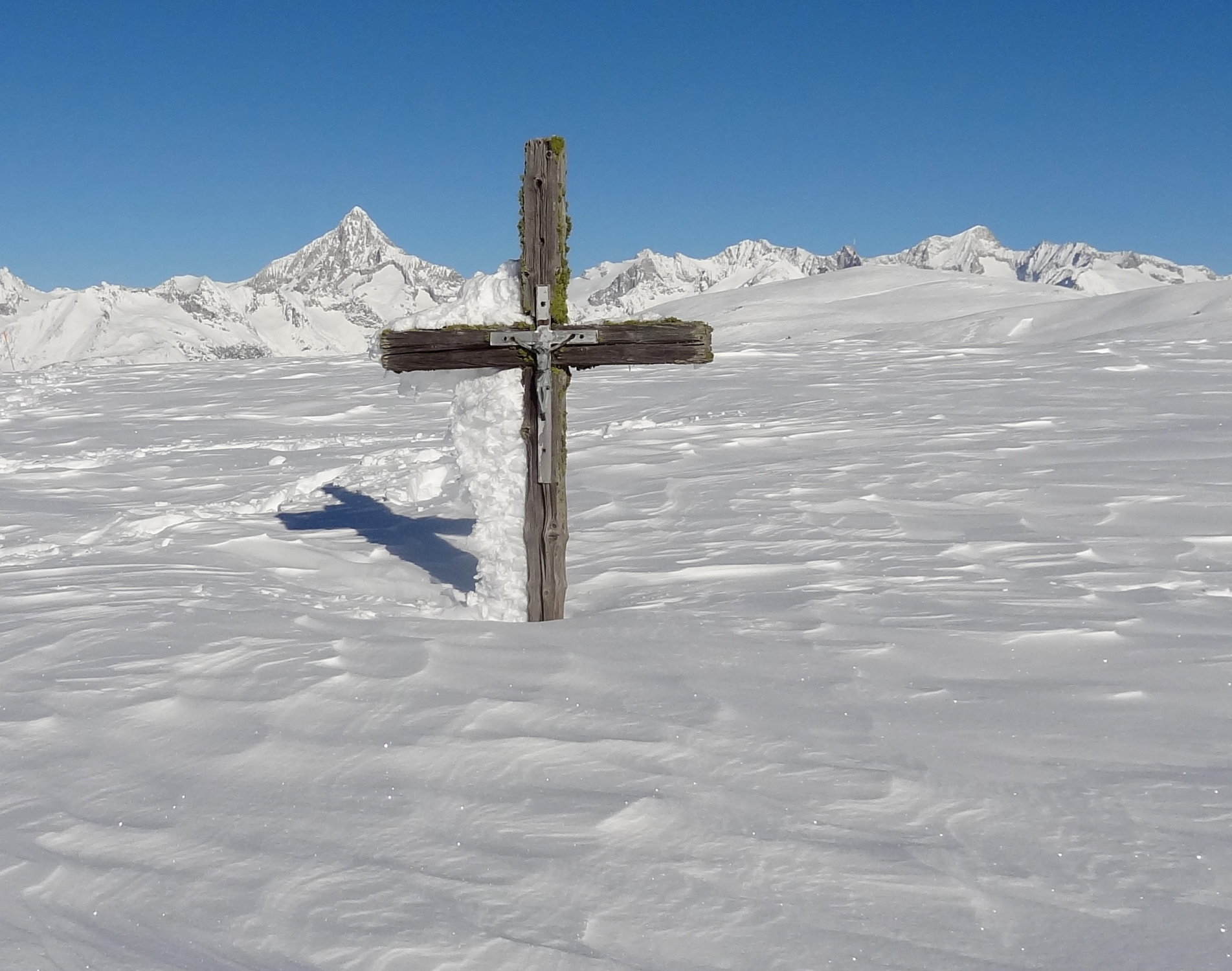 Will man oder kann man, egal aus welchem Grund, keine grosse Tour machen, ist der Gibidumpass mit Rothorn oder Gibidum, eine der besten Adressen. Erleichterung durch Sessellift, bis zum Gibidum eine maschinelle Spur, eine atemberaubende Aussicht, da kann man schon sehr zufrieden sein. Das dachten wir heute auch. Das Spuren in den Schneeverfrachtungen nahmen wir, angesichts der Aussicht, gerne in Kauf. Und die wenigen Pistenfahrer verloren wir bald aus den Augen und waren allein auf dem Rothorn. Ich suchte einen "richtigen" Gipfel, aber das Rothorn scheint, auf Anfrage, einer der Buckeln zu sein, die im Grat zum Ochsenhorn sind. Ich glaube in all den Jahren Dies noch nie erlebt zu haben: eine kompakte Hochnebeldecke über das ganze Rhonetal inklusive Mattertäler und Obergoms. Visperterminen ist im Winter wie im Sommer ein Wanderparadies.