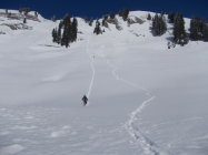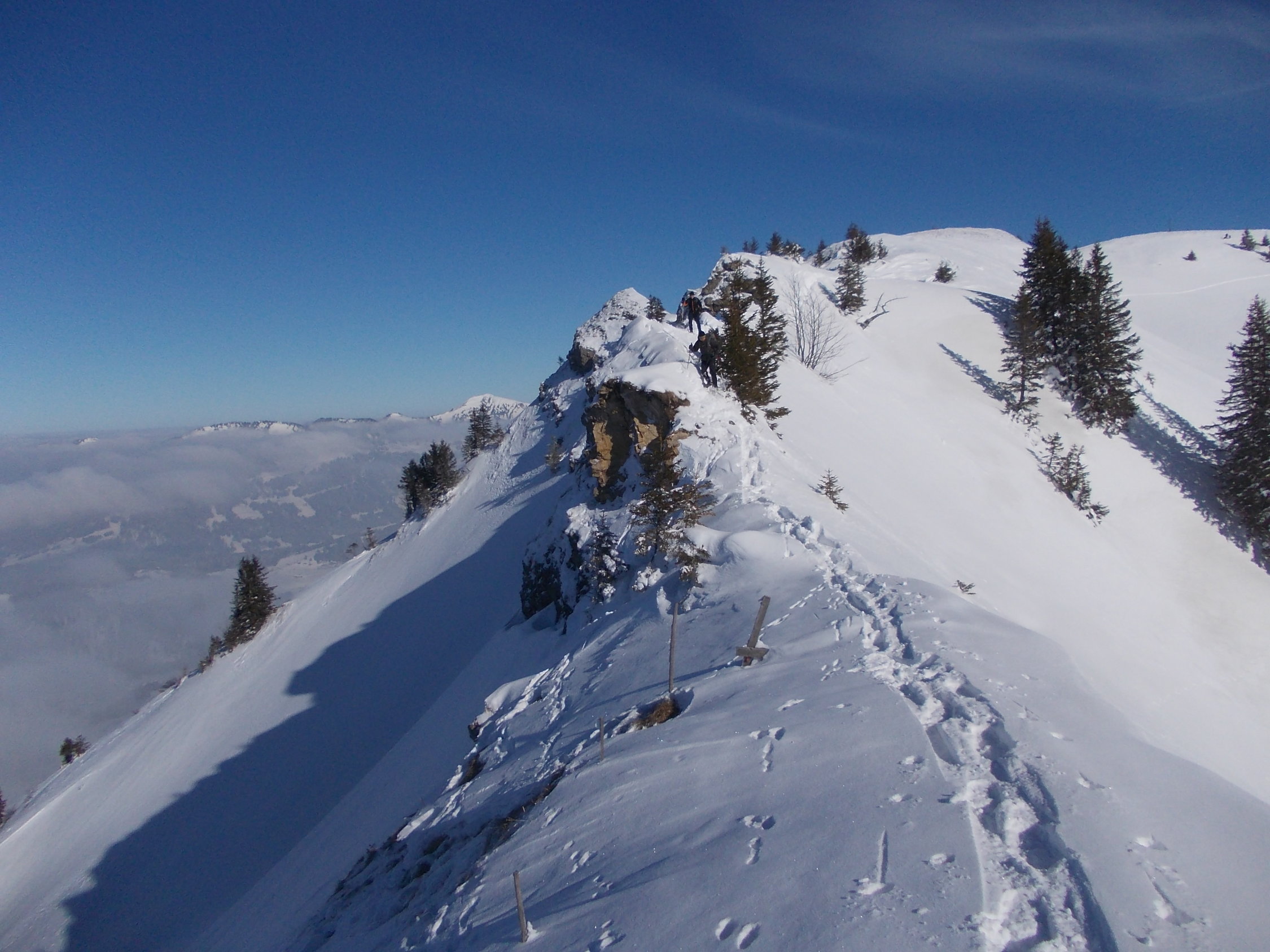 Nun folgen wir dem vor uns liegenden Kamm zwischen Bullerschkopf und Winterstaude, dabei auf eventuelle Wächten achtend. problemlos wird die Hohe Kirche (1747 m, mit Gipfekreuz) erreicht. Zunächst hinab, dannn abermals hinauf zum Punkt 1807. Von diesem geht es sehr steil hinab. Wir sind über einen weiteren Steilhang bis zur Lingenauersalpe (ca. 1530 m) abgestiegen. Möglicherweise ist es gescheiter, nach dem ersten Steilabstieg gleich wieder zum Grat hinüberzuschwenken, um über diesen zum Gipfel der Winterstaude zu gelangen. Diese Passage ist definitiv die Schlüsselstelle der ansonsten eher unproblematischen Tour.