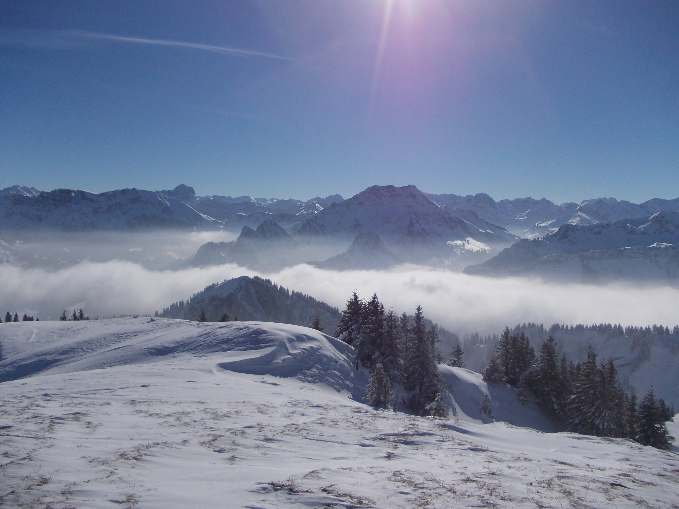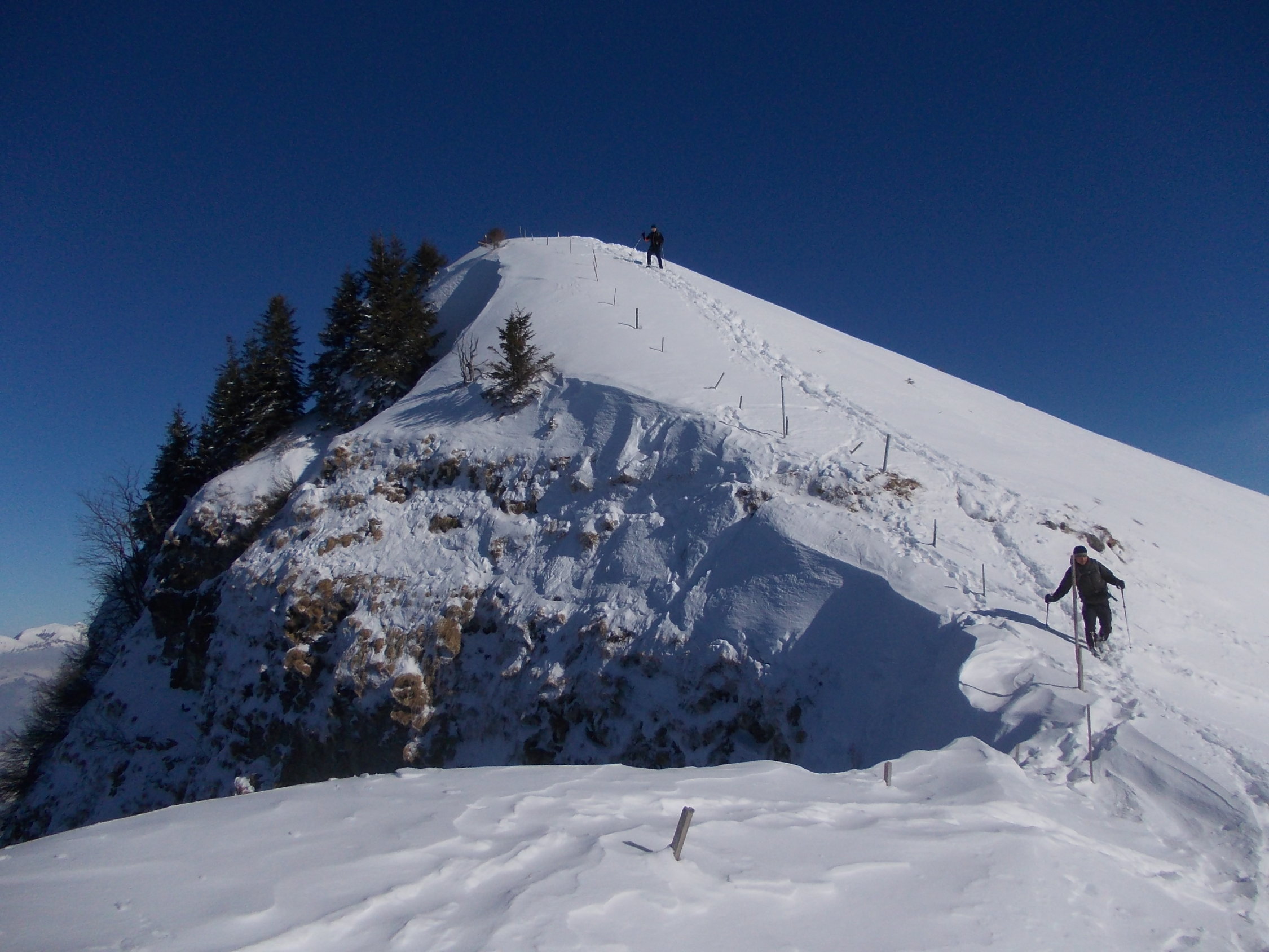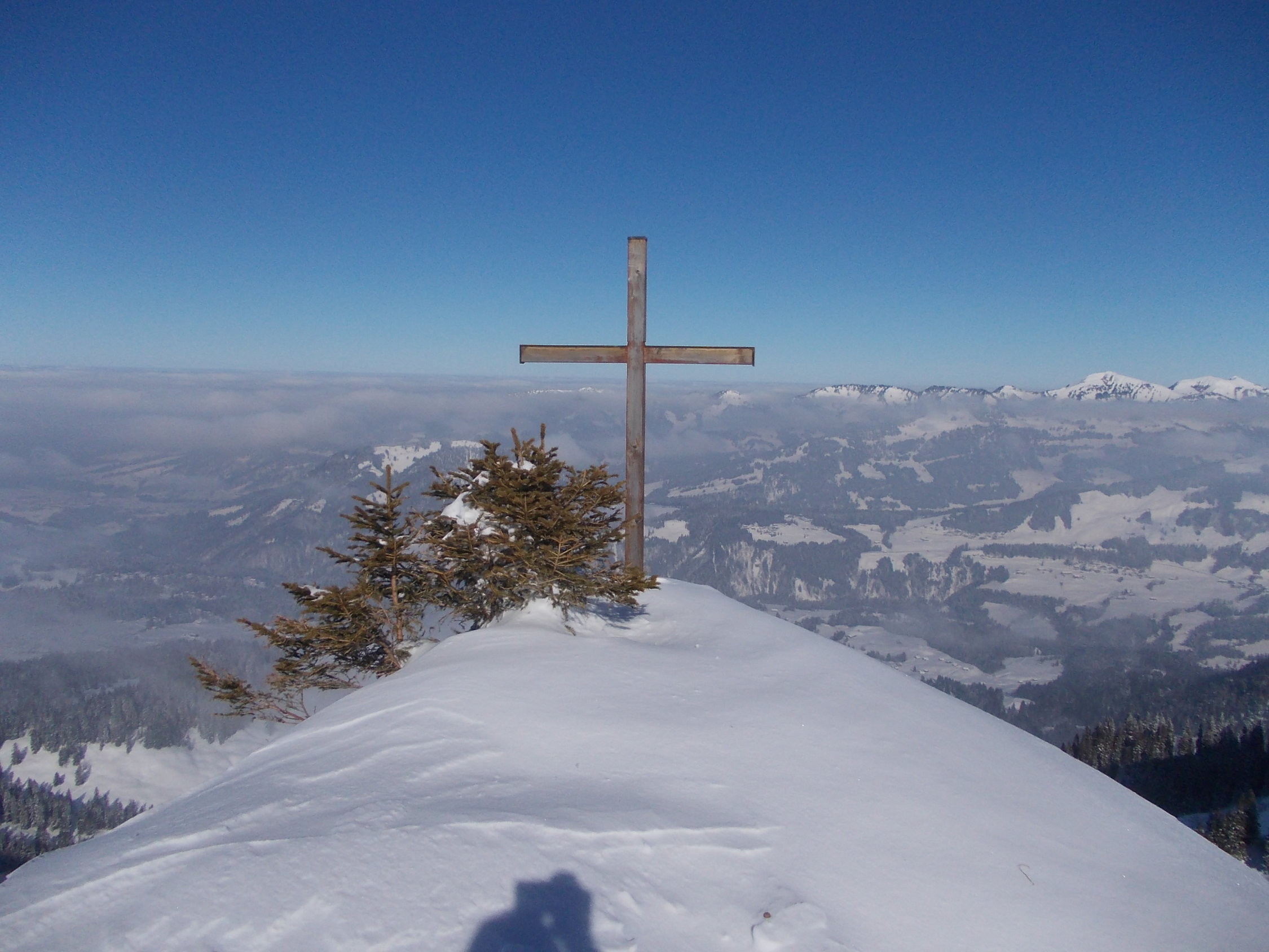 über Bullerschkopf und Hohe Kirche Vom Parkplatz des kleinen Skigebietes in Schetteregg (1080 m) aus folgen wir zunächst dem gebahnten Winterwanderweg über Hammeratsberg ("Leo´s Hütte") bis zur Unteren Falzalpe. Über das kleine Brückchen hinweg gehts dann die Hänge hinauf zur Isenwartalpe 81361 m). Der weitere Anstieg erfolgt zunächst durch den Wald (Sommerweg) und führt uns auf den freien Nordostrücken des Bullersckopfes (1761 m). Wir erreichen den Gipfelkamm und bald danach das Gipfelkreuz.