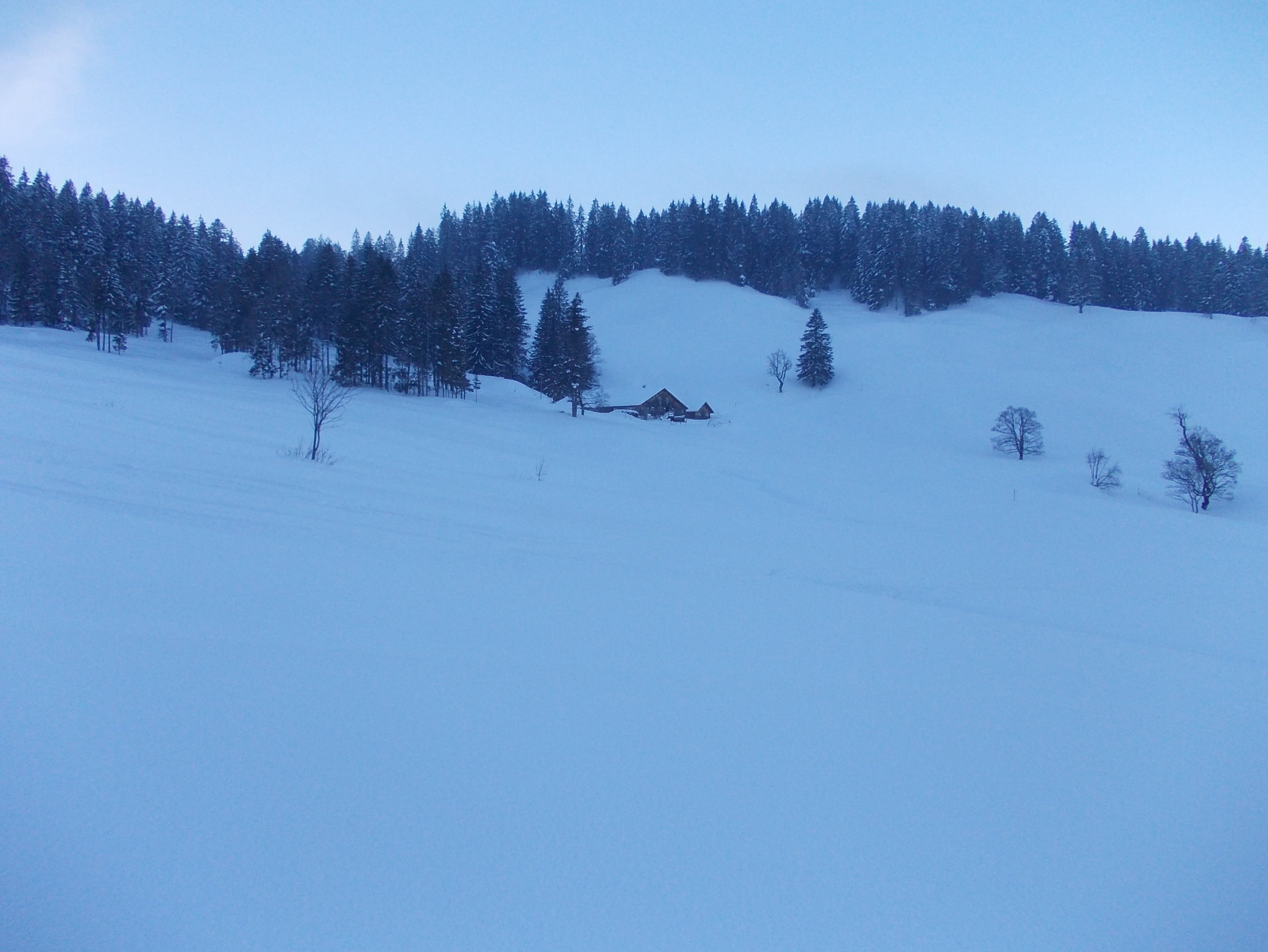 Der Abstieg durch die steile Nordflanke entspricht der Winter-Normalroute auf die Winterstaude. Über die Bühlenalpe erreichen wir die Untere Falzalpe und kehren auf dem am Morgen gekommenen Winterwanderweg zurück nach Schetteregg.
