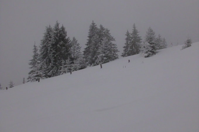 Von unten bis oben Pulverschnee.....oberhalb der Waldgrenze schon etwas schwerer, jedoch sehr gut fahrbar. Im Bereich der Karren muss noch etwas auf Steine geachtet werden...