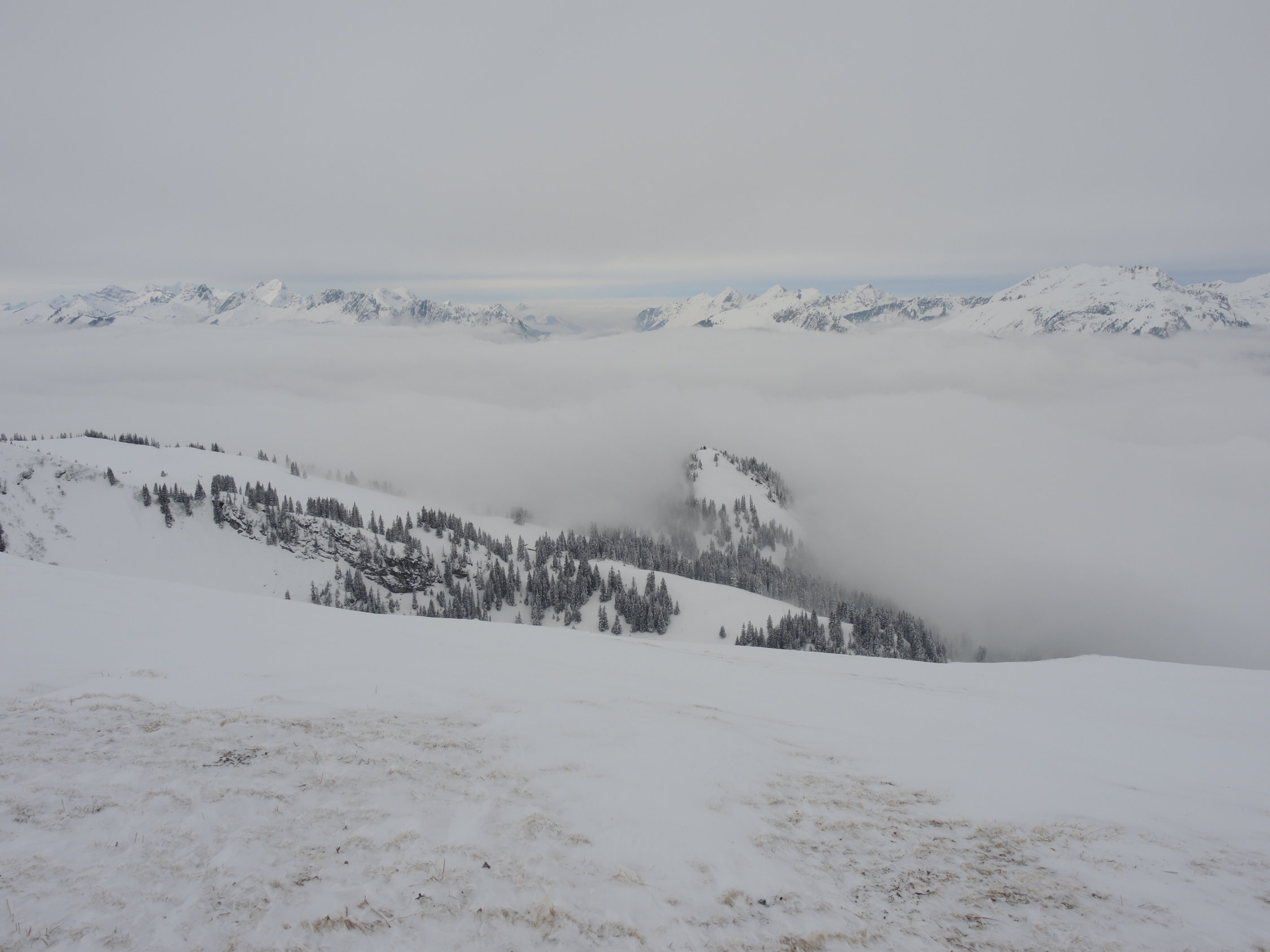 Nebel, starke Bise, Zurück auf der Aufstiegsroute bis zur Skilift Bergstation, Abfahrt bis Simmenbrücke sehr gute Verhältnisse