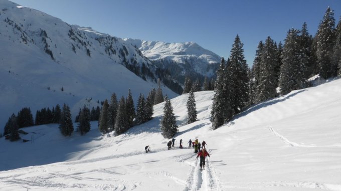 Wir hatten auf der Sonnen-Plaisir-Tour wunderbare Verhältnisse. Das hat natürlich viele Gleichgesinnte angezogen. Ich denke, dass nach den traurigen Lawinenunglücken sichere Varianten gesucht werden, zu denen diese Tour auch gezählt werden kann. Dementsprechend war schon viel verspurt. Wir fanden jedoch an den Randbereichen immer wieder unverspurten Pulverschnee. Zwischen Mittelsäss und Untersäss wandelte sich der Schnee schon langsam um. Vier Spuren führten vom Gipfel durch die Westflanke hinab.