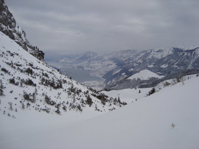 Schon die Waldstrasse ist gut gedeckt. Nach oben hin gesetzter Pulver mit Unterlage. Einige Geländekuppen oberhalb der Fluonalp sind recht abgeblasen. Dies hat aber keinen Einfluss auf die Abfahrt. Jedoch ist die Direktabfahrt vom Gipfelkreuz, infolge dessen, ohne Schaden am Skibelag nicht möglich. Bis zur Einfahrt in den Hang muss man ca. 25m den Grat runterfahren.