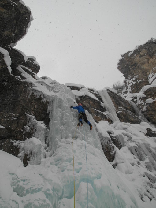 Ich habe oben in der rechten Variante, dort wo das Eis die Latschen erreicht, eine Abseilschlinge zurückgelassen, darüber hängen meine beiden Eisgeräte an einer Latsche. Man muss vom EIs ca. 1,5 hoch unten in die LAtschen reinklettern und findet dann die Abseilschlinge und hoffentlich auch meine Geräte.