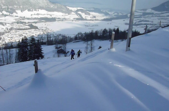 Temperatur -11 Grad in Grandvillard. Die Route ist gut eingeschneit und mit Ski durchgehend begehbar und befahrbar. Pulverschnee auf tragender Unterlage. Gipfelhang ab Pkt 1846 abgeblasen. Ab hier ist Tour im Nebelmeer versunken. Harscheisen nicht zwingend aber hilfreich. Abfahrt gemäss Routenbeschrieb durch schönen Pulver, zuerst mit wenig bis Null Sicht, dann zunehmend bessere Sichtverhältnisse bis Les Baudes.Die Sonne zeigte sich auch hier nicht. Der Strasse folgend bis La Cierne (Pkt 1069). Abkürzung durch den Wald auf schmalem Pfad und dann parallel dem R. des Marais entlang zur Fahrstrasse und weiter zu Pkt. 936. Ein letzter schöner Hang und Abfahrt auf der Fahrstrasse nach Grandvillard.