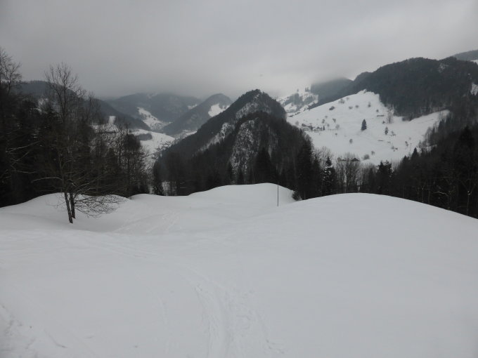 Schnee: Es hat durchwegs gute bis sehr gute Schneeverhältnisse und das bis hinunter zum Hof Schachen 594m. Wenn man sich im Gipfelbereich etwas am Waldrand orientiert, findet man auch dort noch unverfälschten Pulver (weder verfahren noch windbearbeitet). Grundsätzlich hält man sich für die Abfahrt auch weiter unten mit Vorteil ganz links bzw. an den nördlichen Waldrändern.