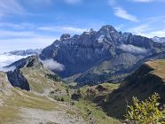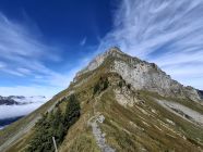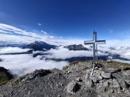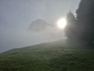 Abmarsch beim Naturfreundehaus, um ca. 10 Uhr, im Nebel. Nach einigen Höhenmetern zeigte sich aber schon die Sonne. Die Wege waren etwas feucht, die Felsen jedoch, in der SW- Flanke und im Riss zur Gipfelflanke, waren trocken. Die Gipfelflanke hatte etwas Schnee und die Steine waren dementsprechend feucht und rutschig (darum ein "gut" und kein "ausgezeichnet"). Herrlicher Gipfelblick, über den Wolken.