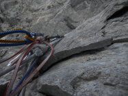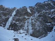 Machbar, aber nicht ideale Verhältnisse. Generell eher wenig Eis, L3 und L4 sind mixed und erfordern Absicherung im Fels. Im Detail: in L1 eher wenig, eher altes Eis. Gut ausgehackt mit vielen Hooks, drum gut machbar. L2 ist gut, oben interessante Kletterei über einige Balkone hinweg. In L3 sind eher nur Eisglasuren vorhanden, zum Schrauben reicht es kaum und im Fels kann man auch nicht à discretion sichern, dafür ist's nicht so schwierig. Am Anfang von L4 steht nur eine dünne, glasig-fragile Säule, an der man nicht wirklich klettern kann. Am überhängenden Kamin kommt man aber auch im Fels hoch, mit etwas Kreativität kann man dort auch recht gut sichern. L5 ist am Anfang kurz mixed, durchs Loch und obenraus dann gutes Eis. Durchschlupf durchs Loch war für mich (190cm) nur knapp möglich. Die Gesamtbewertung von WI5 passt im Moment nicht, eine Angabe von M5-M6 ist besser. Keile 4-9 und Camalots 0.3-1 sind unabdingbar.