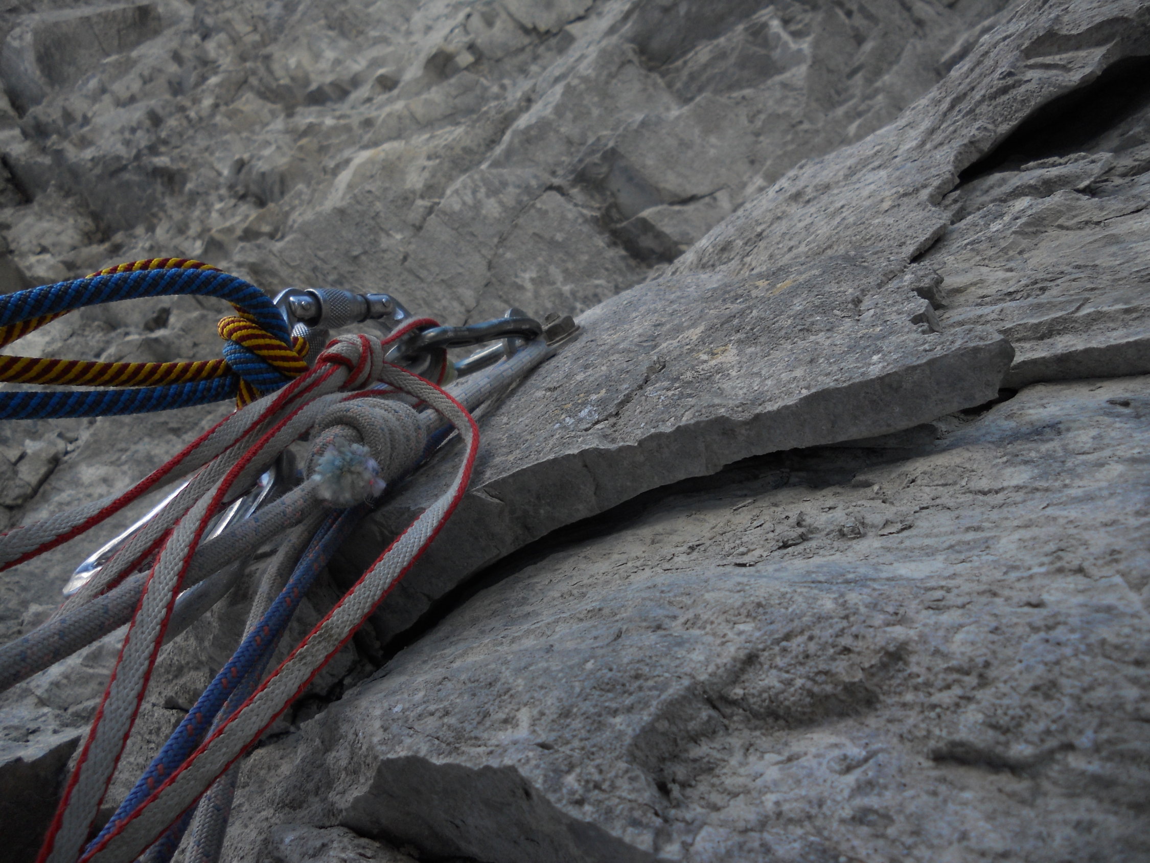 Achtung: beim zweiten Stand auf dem Band steckt einer der BH in einer dünnen, losen Schuppe (siehe Foto). Dieser ist nicht vertrauenswürdig und sollte ersetzt werden!!! Der zweite (untere), in welchem auch das Abseil-Maillon hängt, ist zum Glück besser.