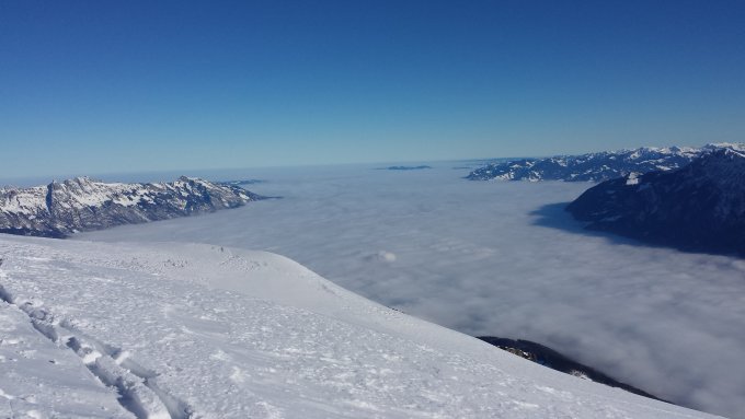 Gipfelaufstieg war mit Skiern möglich. Auf dem Gipfel selber absolut Windstill und sehr mild.
