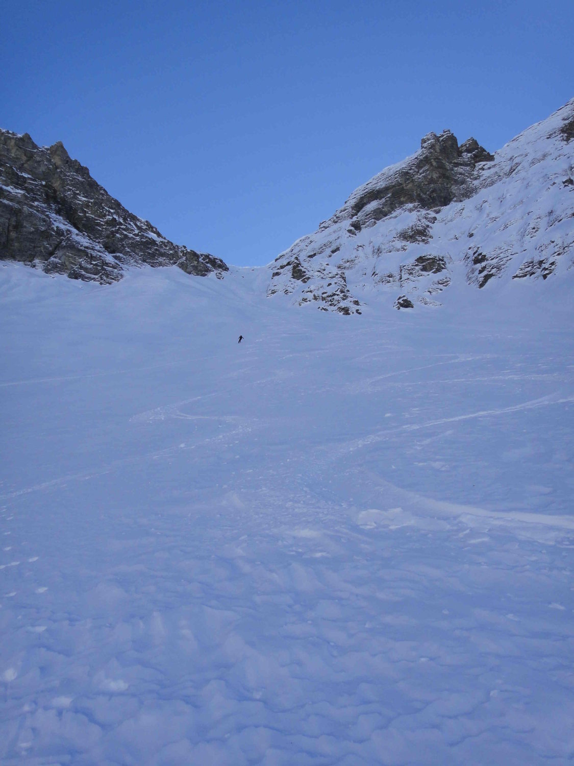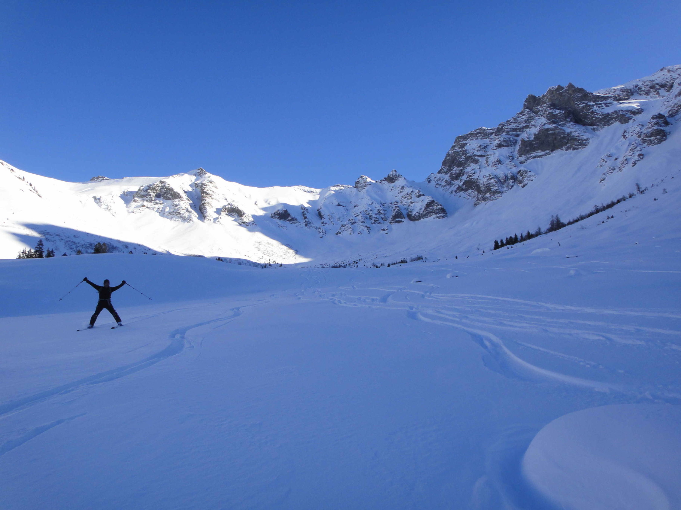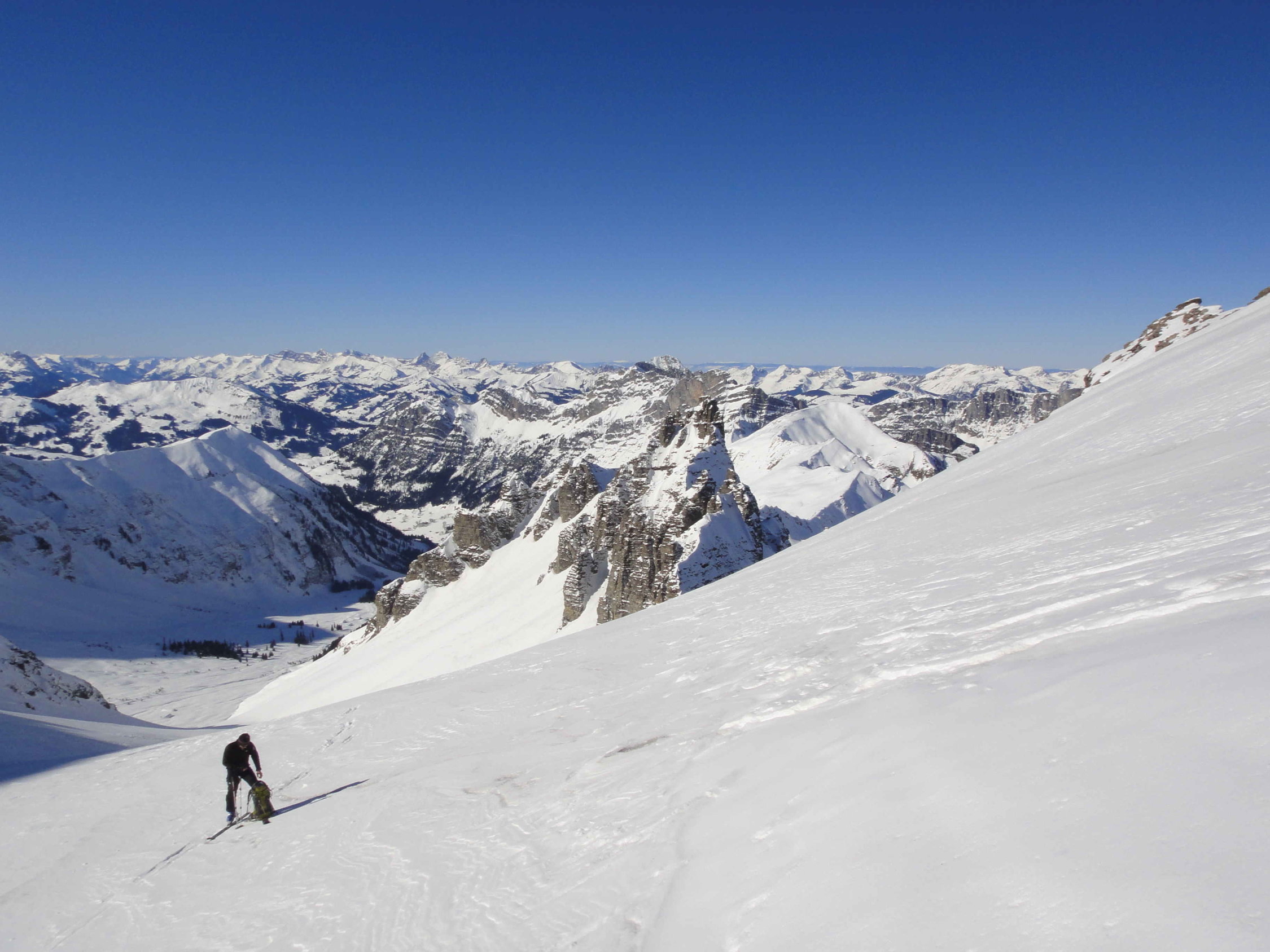 Der Schnee hat sich in den Nordhängen mit den wärmeren Temperaturen gut gesetzt und der steile Hang ins Rügge Tälti machte einen soliden Eindruck.Schnee im Rügge Tälti stark vom Wind geprägt und entsprechend gedeckelt. Im Steinbodenhang haben wir noch mehrheitlich Pulver angetroffen. Bei der Pulverabfahrt in den vorderen Fildrich kamen noch Powder-Surf Gefühle auf.