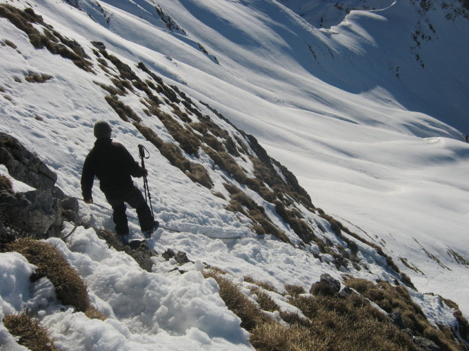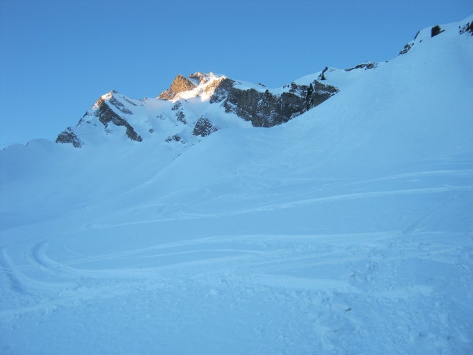 Früh starten lohnt sich. Wir sind kurz vor 7 Uhr losmarschiert und konnten so um 9.30 Uhr die Abfahrt in Angriff nehmen. Gegen Mittag dürfte die Sonneneinstrahlung den Verhältnissen eher schaden.